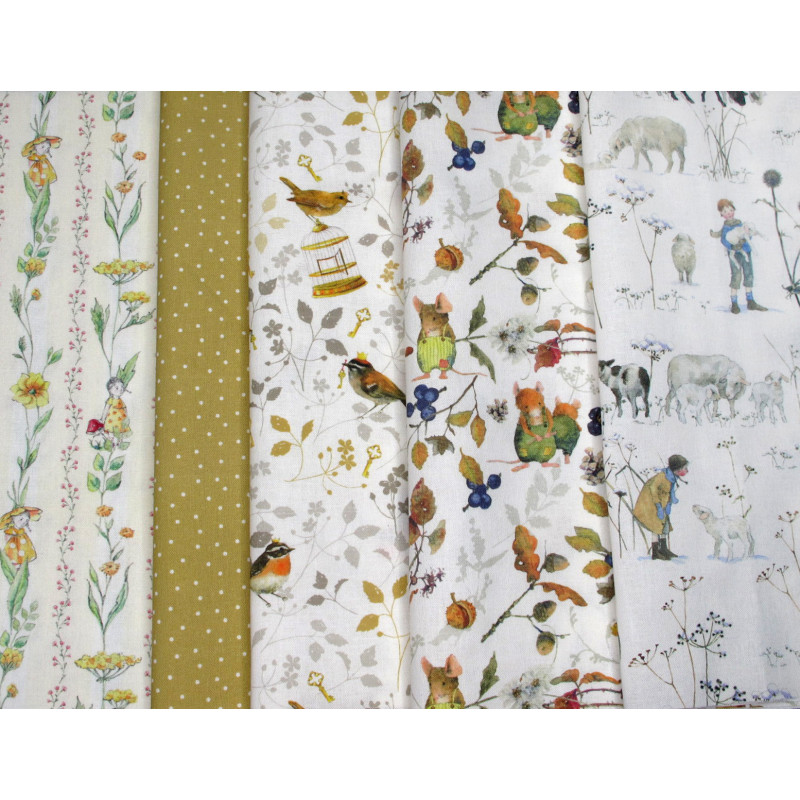 ein Stoffpaket mit 5 wunderschönen Stoffen von Daniela Drescher designed über acufactum in ocker grün creme bedruckt mit den beliebten kleinen Mäusen und Vögeln sowie Blumen - perfekt aufeinander abgestimmt -