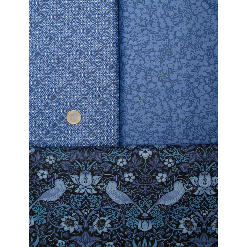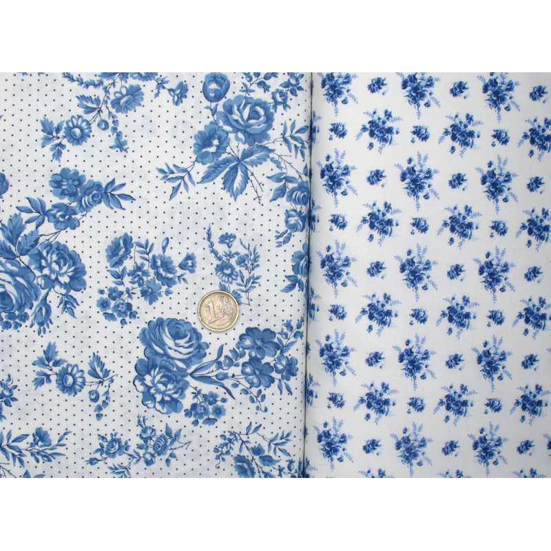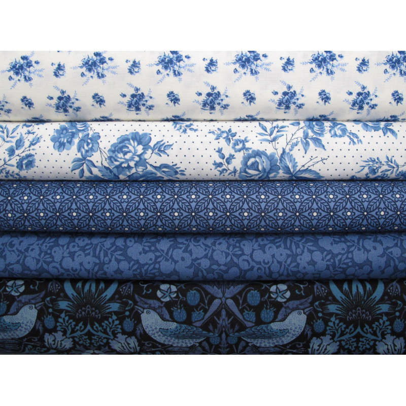 ein Stoffpaket mit 5 wunderschönen Stoffen in blau weiß mit Rosen Blumen Sternchen Vögeln - perfekt aufeinander abgestimmt -