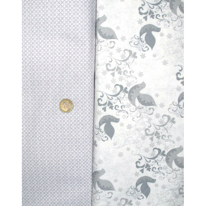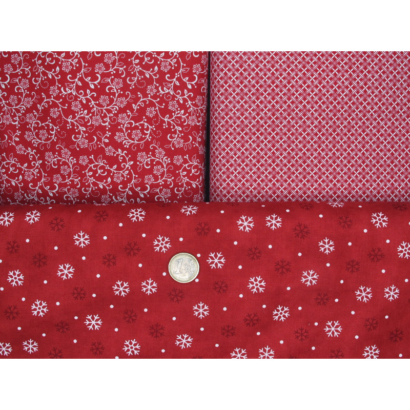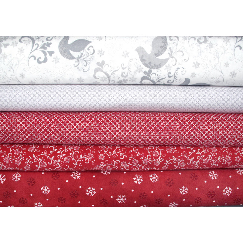 ein Stoffpaket mit 5 tollen Weihnachtsstoffen bedruckt mit Eiskristallen/ Schneeflocken Vögeln Ornamente in grau weiß rot und dezent silber- perfekt aufeinander abgestimmt -