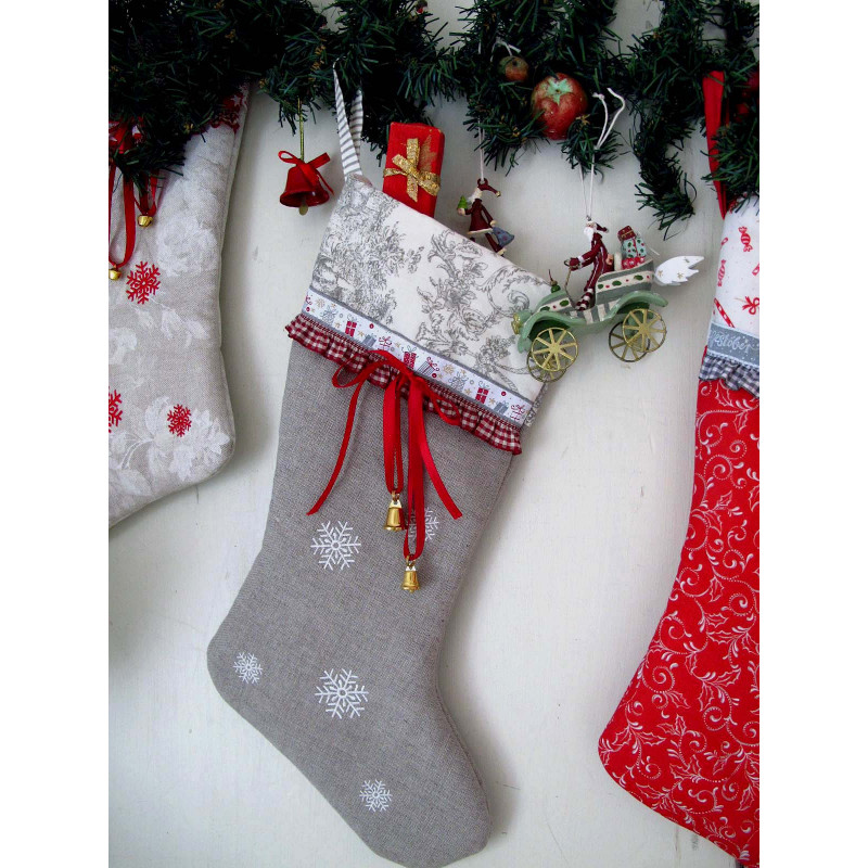 Genäht wurde der Nikolausstiefel aus sehr hochwertigen Leinen- und Baumwollstoffen. Zusätzlich verschönert mit Eiskristall Stickerei und Schmuckborte, Schleife mit 2 Glöckchen. Innen mit einem hellen Stoff gefüttert. Außerdem mit Vlies verstärkt. Das verleiht zusätzlich Stabilität, damit der Stiefel seine Form behält.