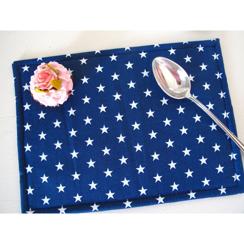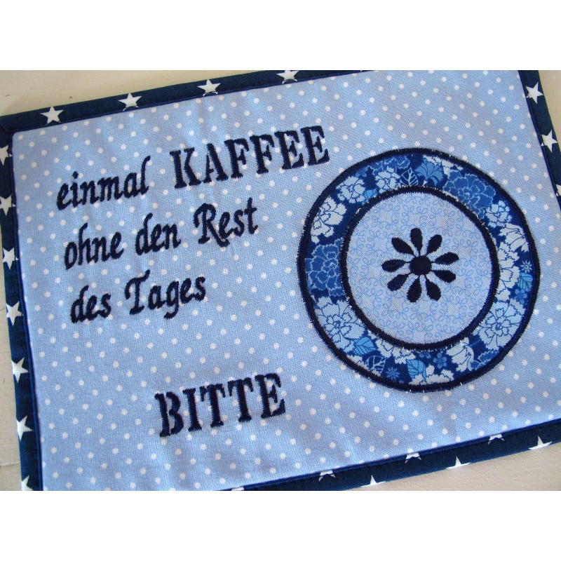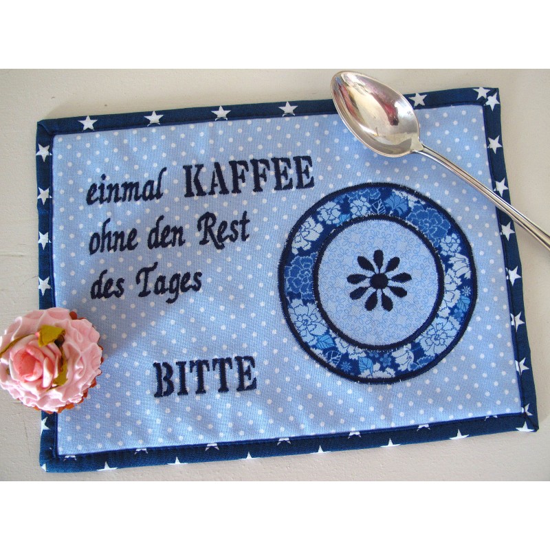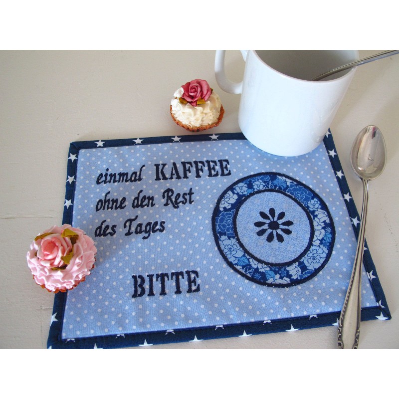 Der Tassenteppich ist bestickt mit einem lustigen Spruch zum Thema Kaffee. Außerdem mit einer Applikation für die Tasse versehen. Verwendet wurden hochwertige Patchwork Baumwollstoffe. Die Füllung besteht aus Thermolam. Dies leitet die Wärme ab.