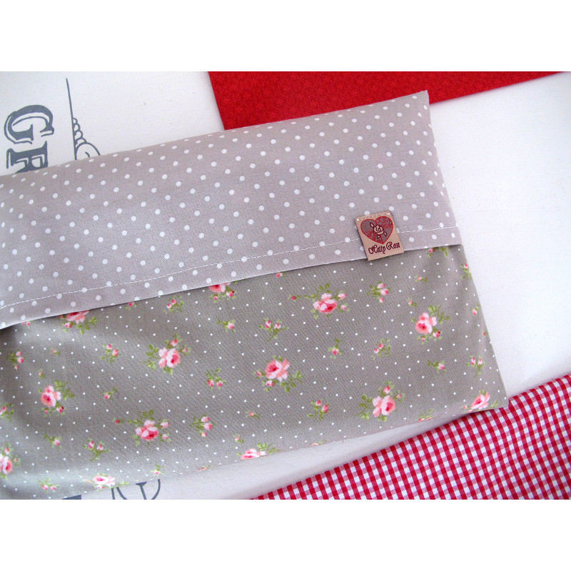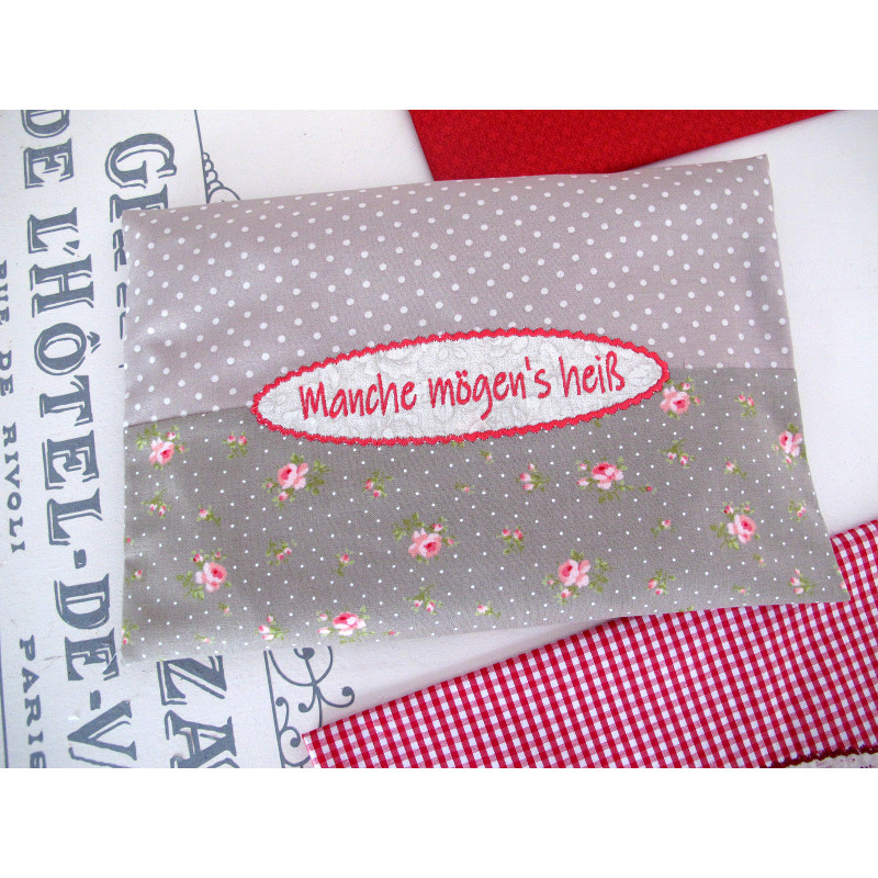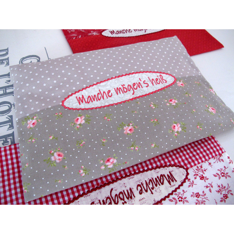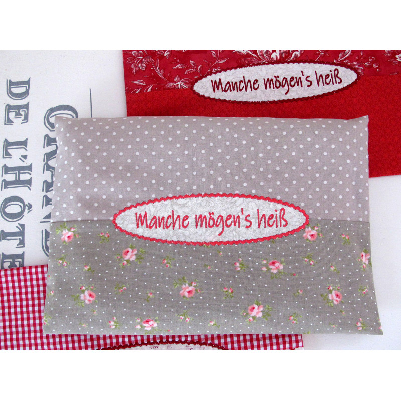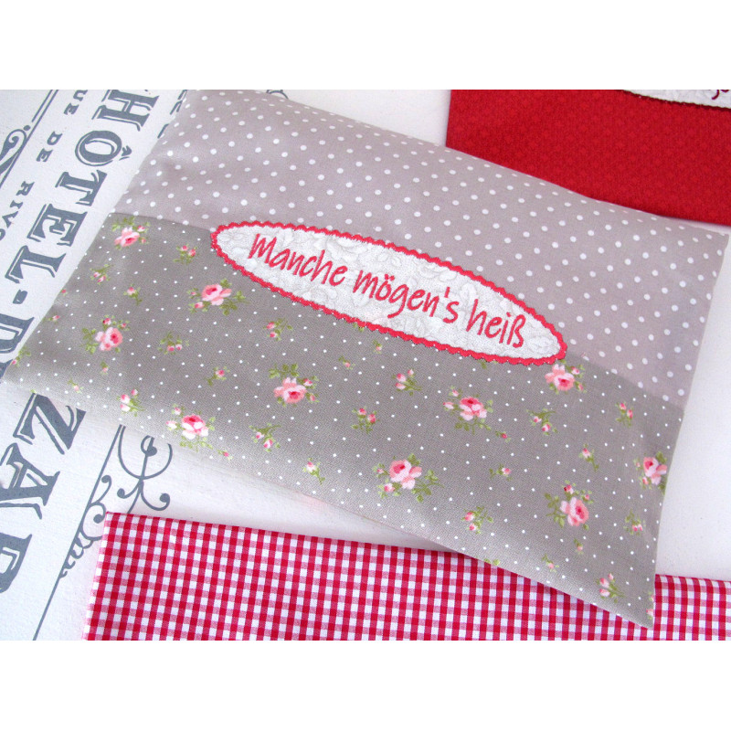 Ein Körnerkissen in taupe und rose aus hochwertigen Baumwollstoffen mit Text und Applikation "Manche mögen´s heiß"