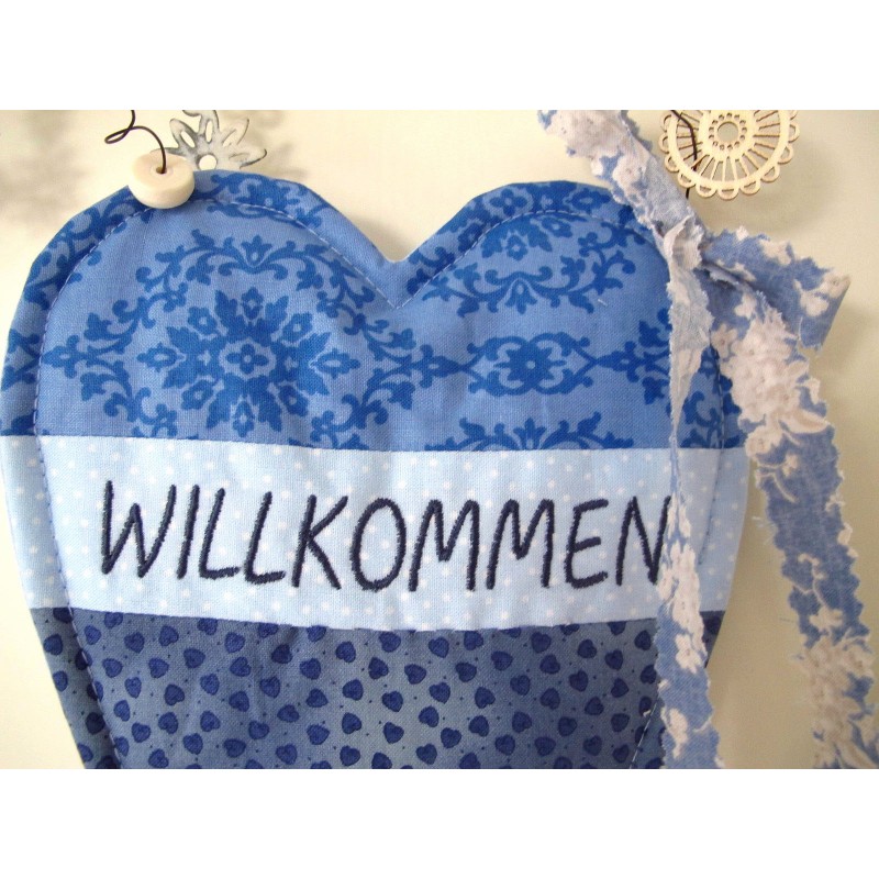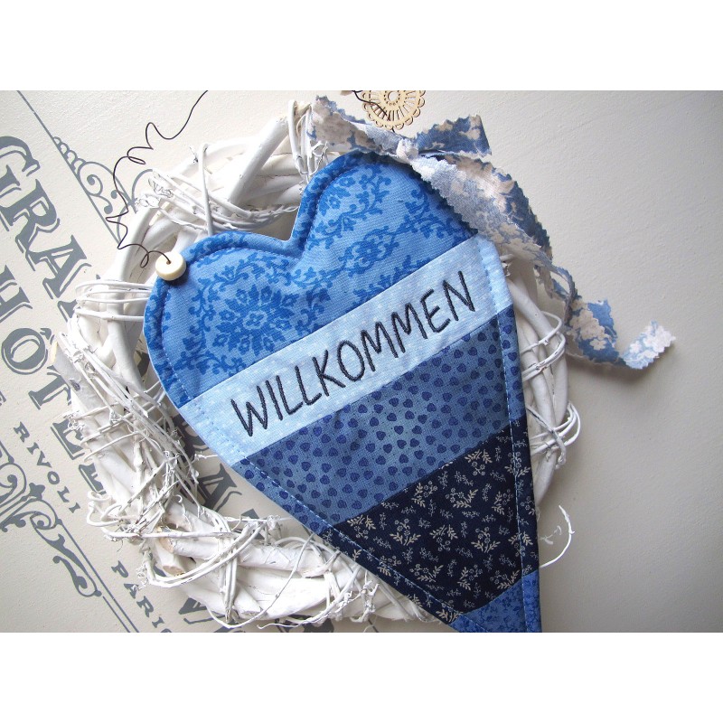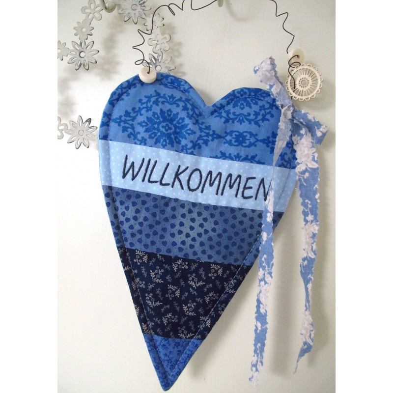 Das lange, schmale Herz ist gefertigt im Patchworkstil. Aus verschiedenen aufeinander abgestimmten, hochwertigen Baumwollstoffen in blau. Mit Stickerei "Willkommen". Zur besseren Stabilität wurde es mit einem dicken Vlies verstärkt. Rundum abgesteppt. Der Drahtbügel wurde mit Holzperlen und Schleife verziert.