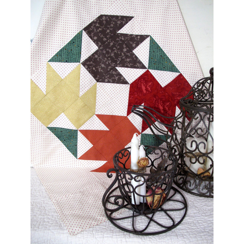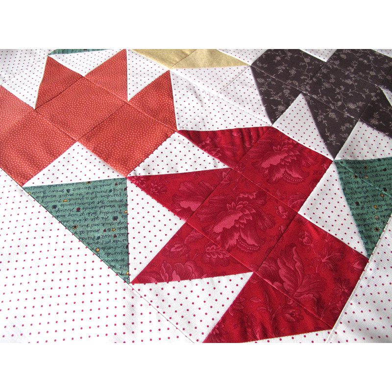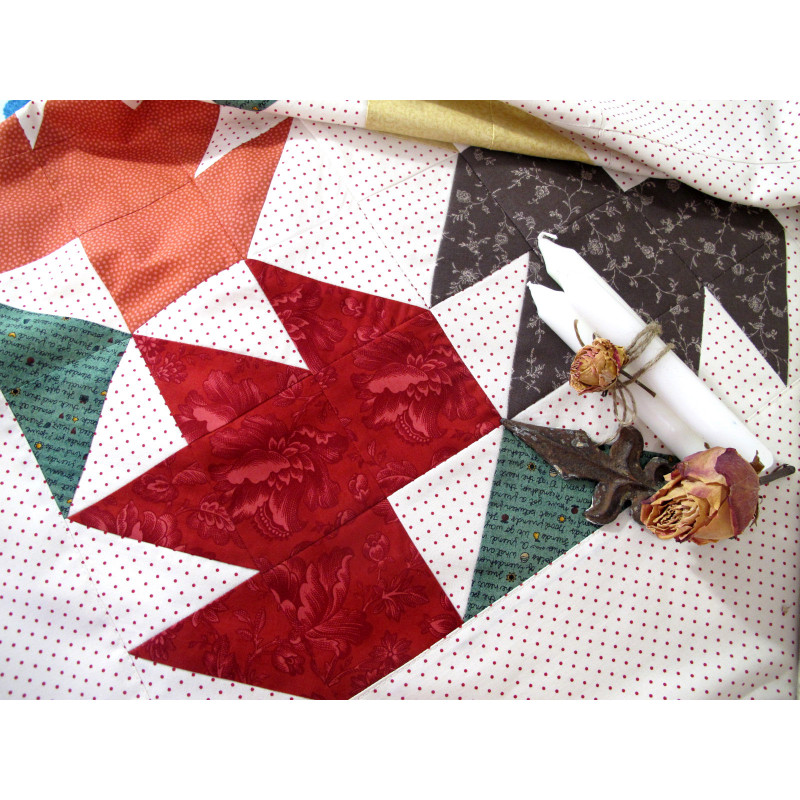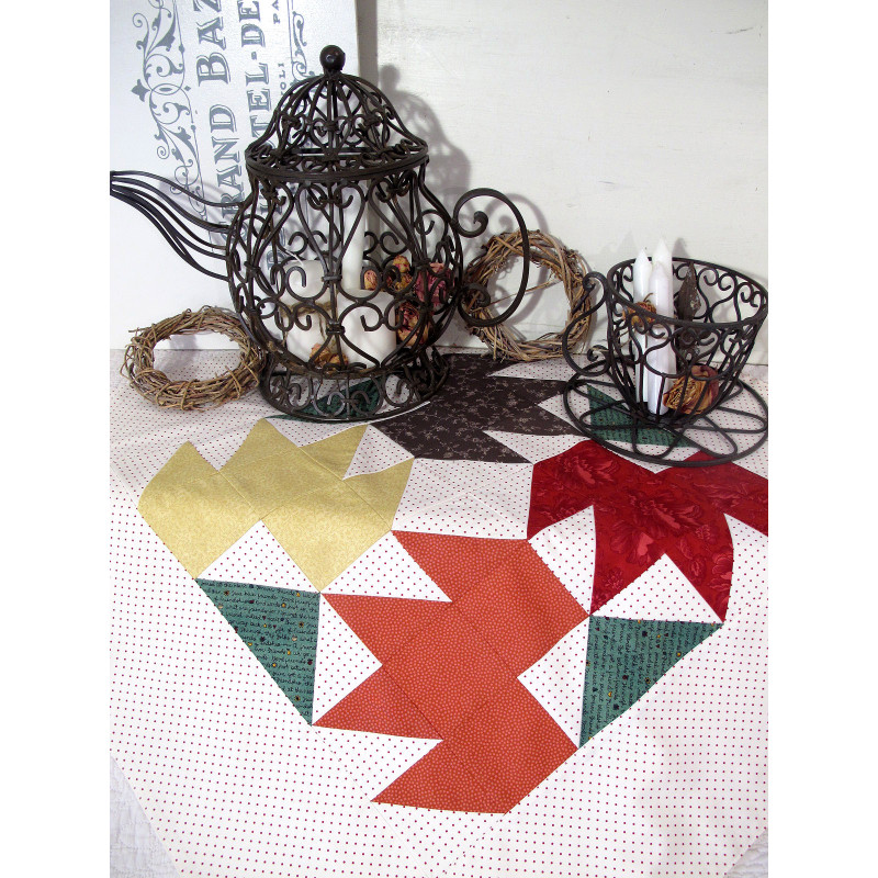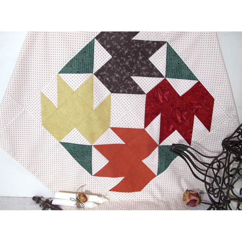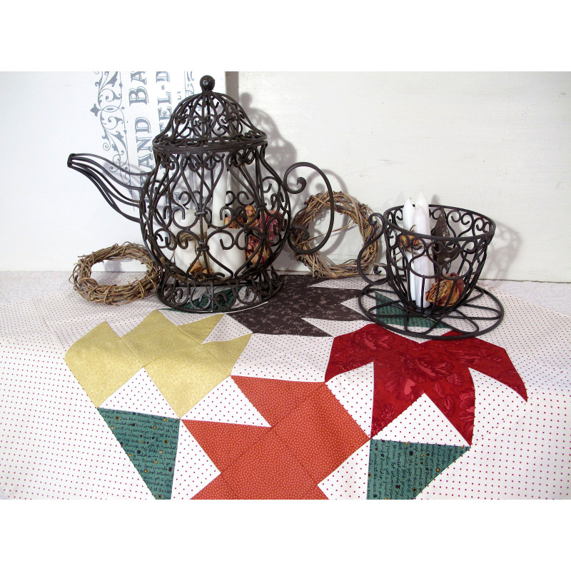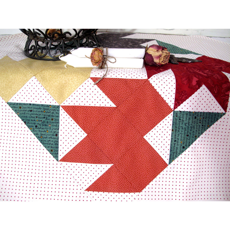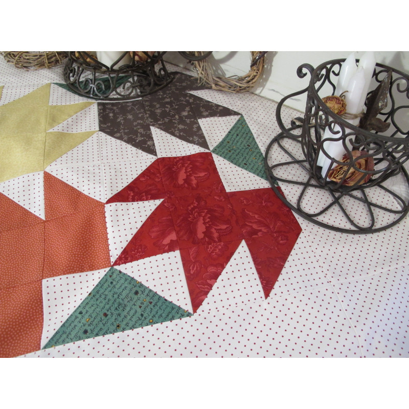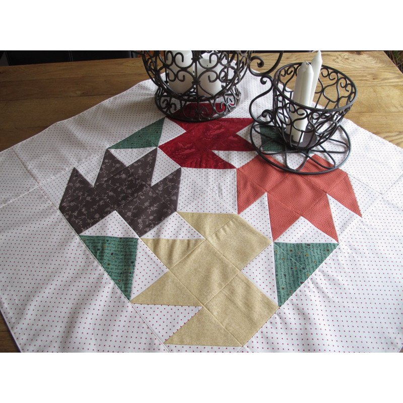 diese Mitteldecke passt perfekt zum Landhausstil. Wir haben sie aus verschiedenen sehr hochwertigen Patchwork-Baumwollstoffen angefertigt. Sie besteht aus vielen kleinen Quadraten und Dreiecken. Diese wurden zu Ahornblättern zusammen gefügt. Ideal für den Herbst und Winter. In gelb, orange, rot und braun mit grün. Damit die Blätter gut zur Geltung kommen haben wir für den Hintergrund einen hellen Stoff mit winzigen roten Punkten gewählt. Die Rückseite ist aus einem weißen Uni. Der Rand ist einmal rundum abgesteppt.