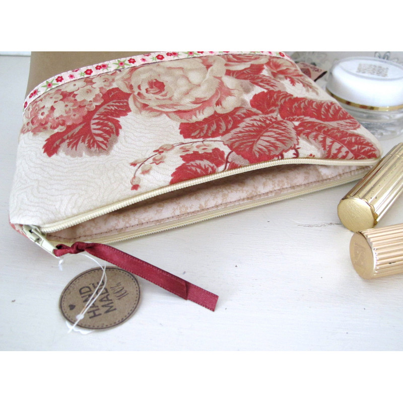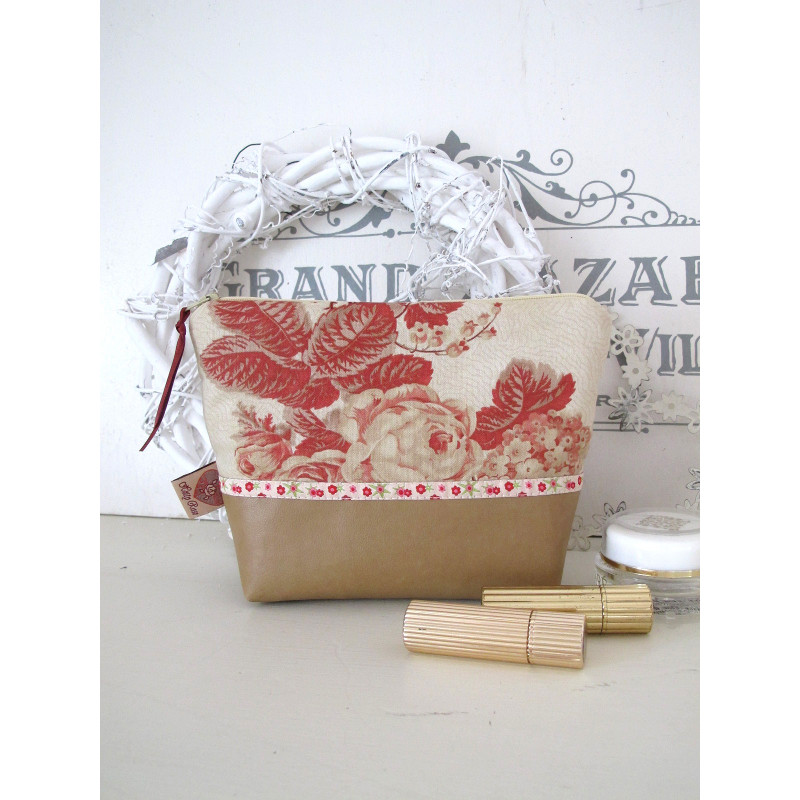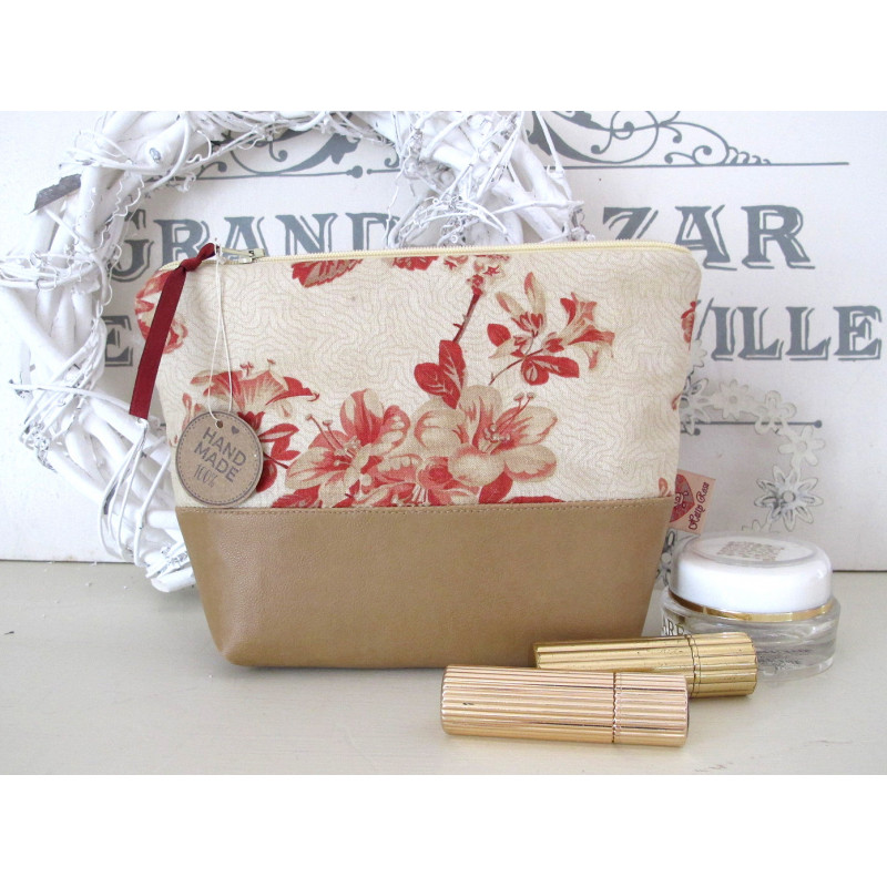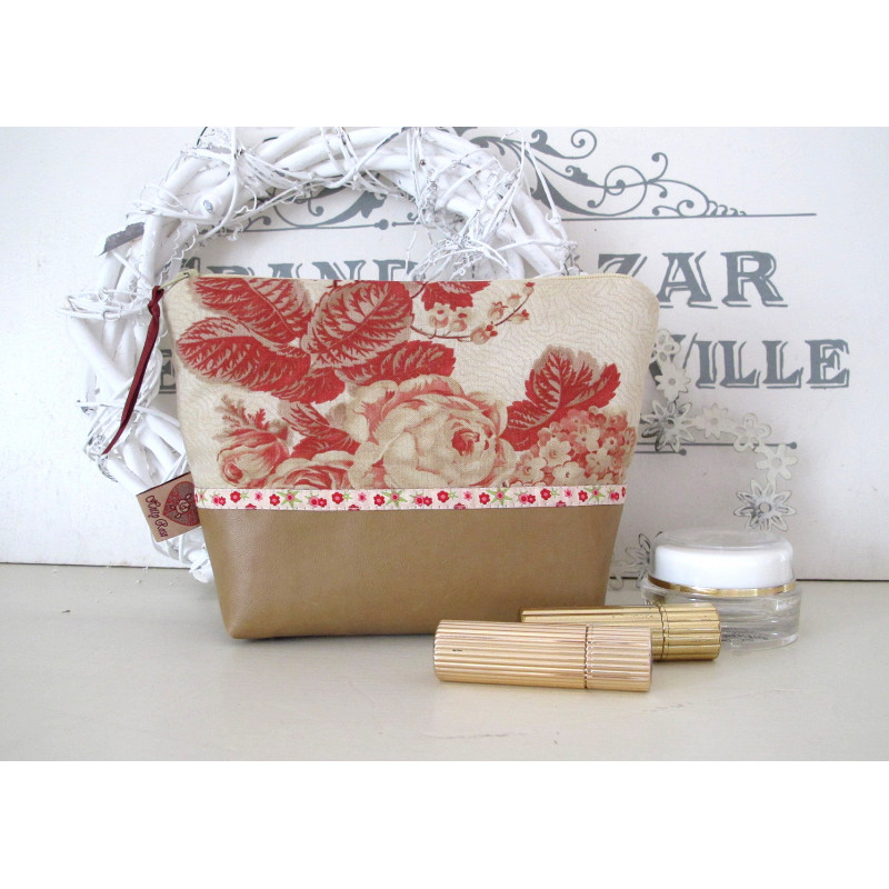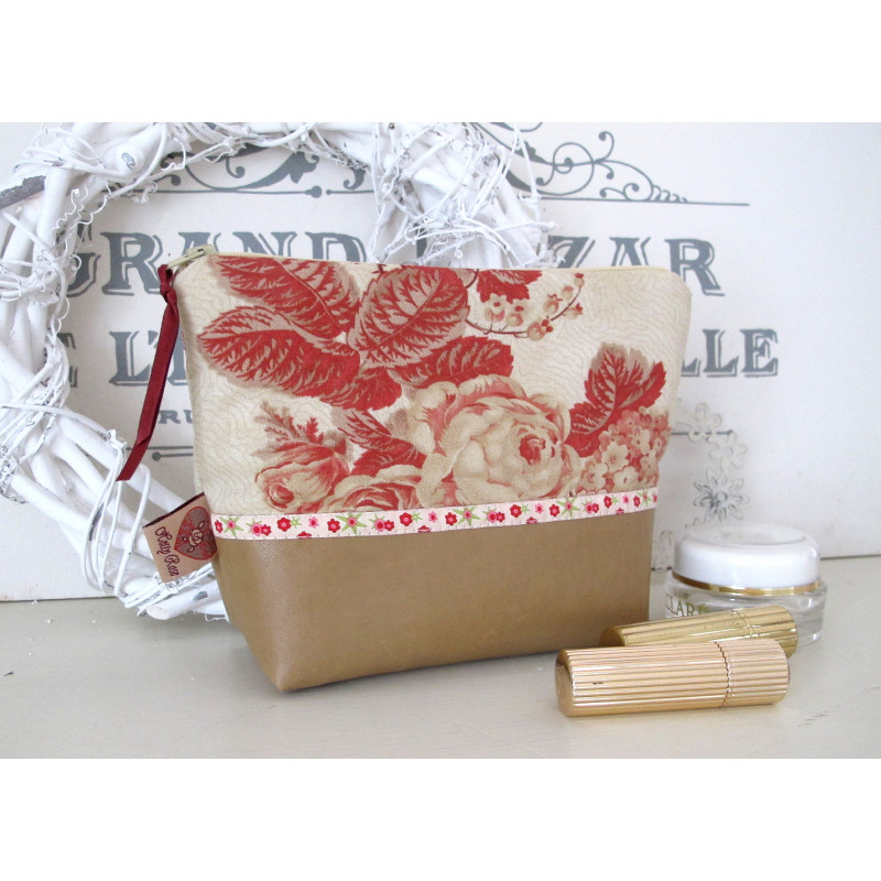 Die Kosmetiktasche ist aus hochwertigen Patchworkstoffen und Kunstleder gefertigt und mit einer hübschen Blumenborte verziert. Mit einem beige gemusterten Stoff gefüttert und zur besseren Stabilität mit einer Vlieseinlage verstärkt.