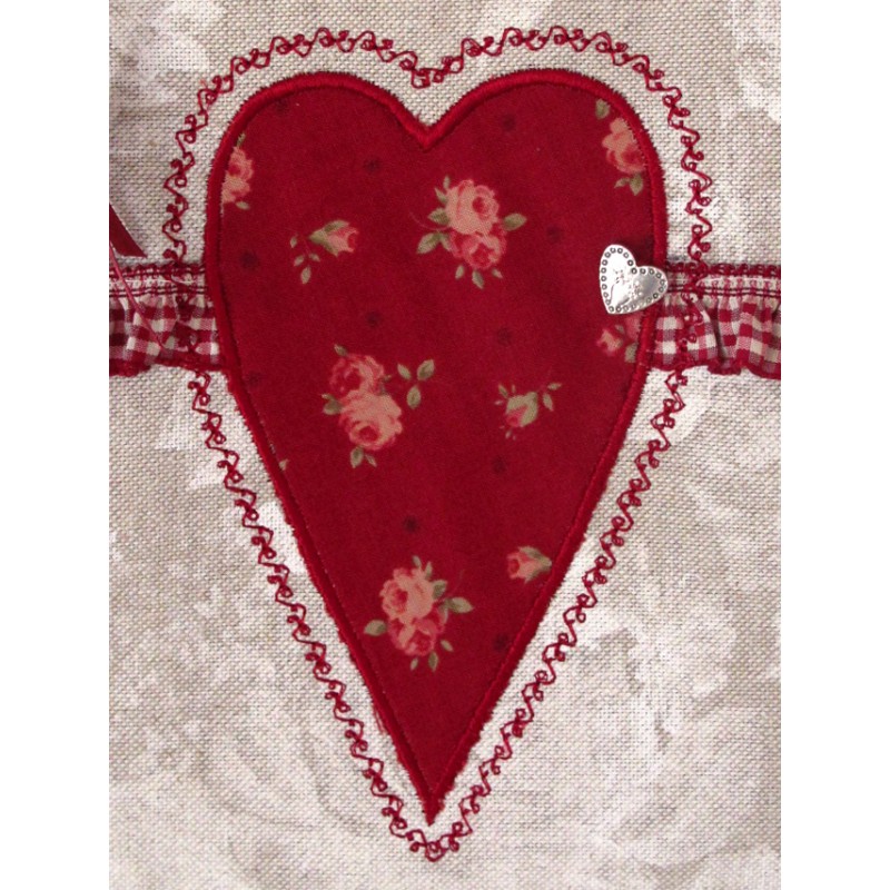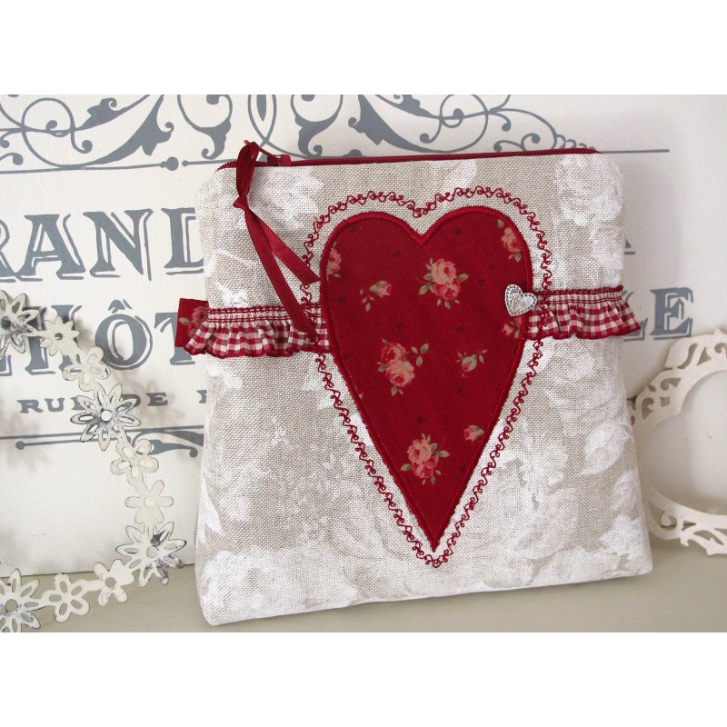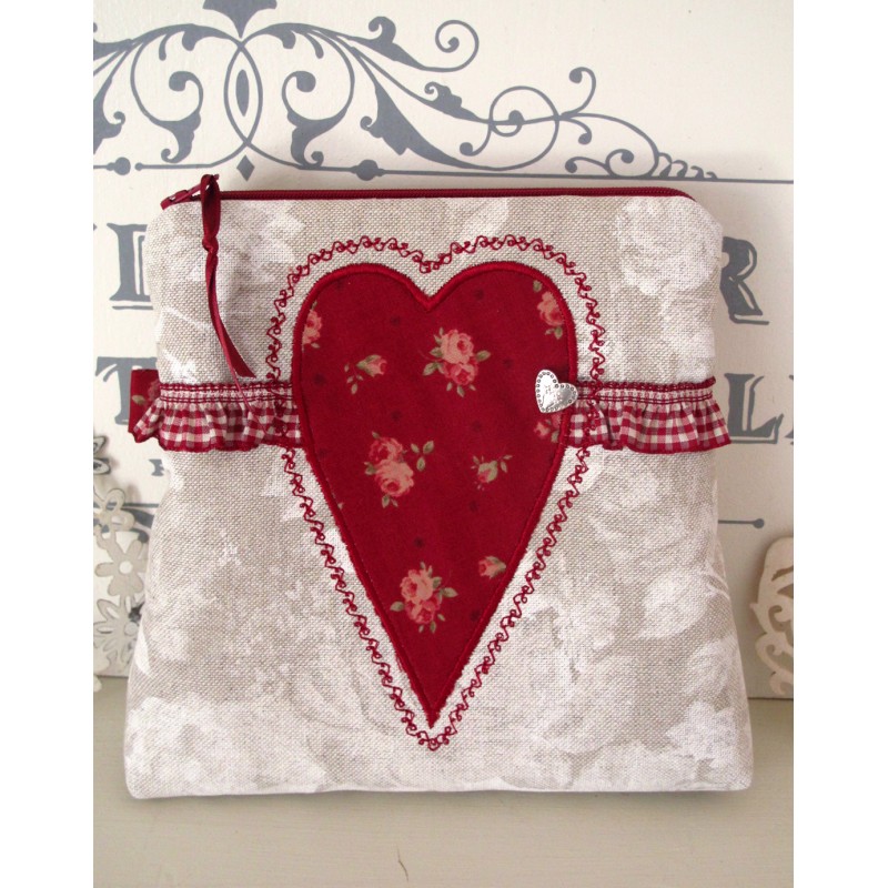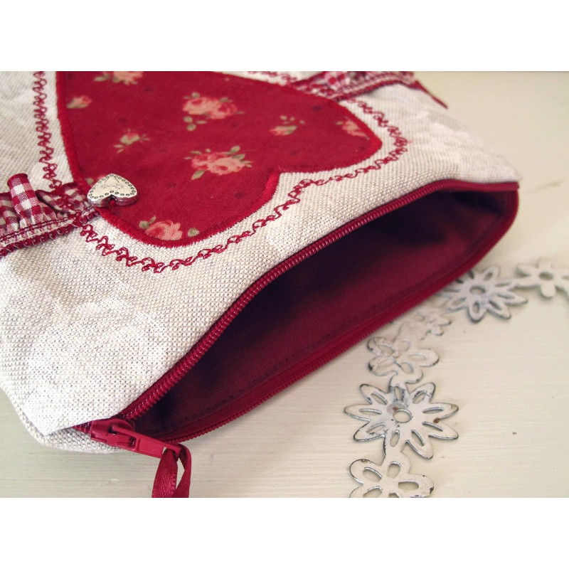 Eine Kosmetiktasche in rot beige mit Herzchenapplikation Rüschenband und Metallknöpfchen in Herzform. Für allerlei Kleinigkeiten. Natürlich auch Kosmetika.