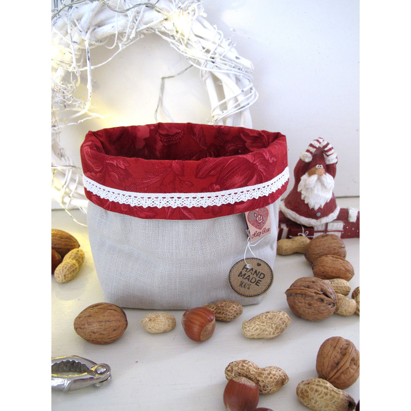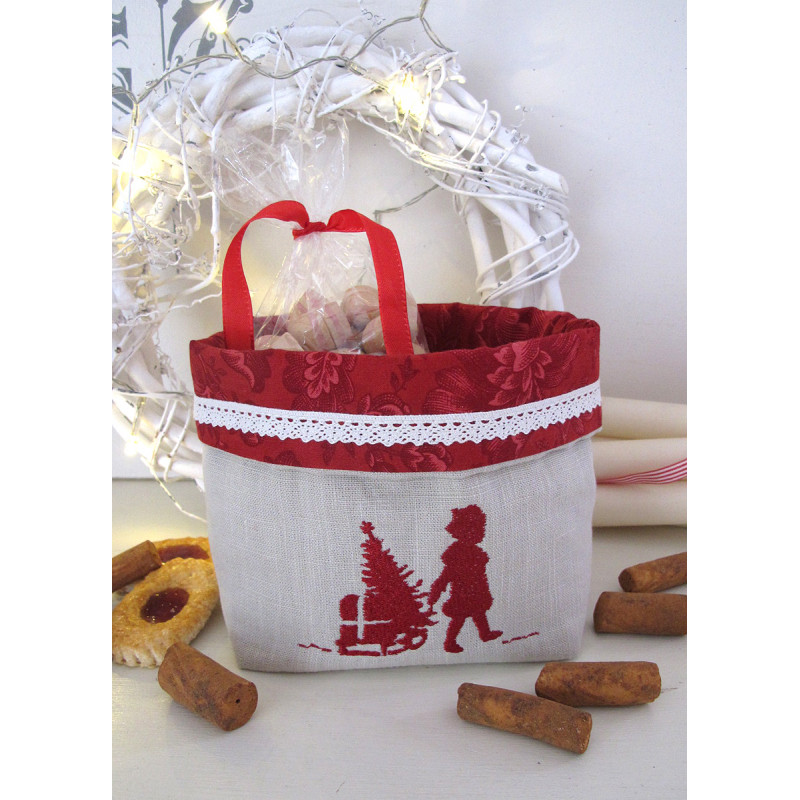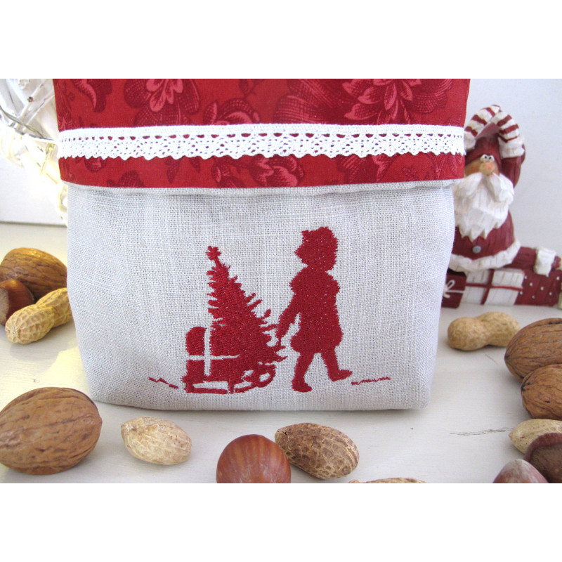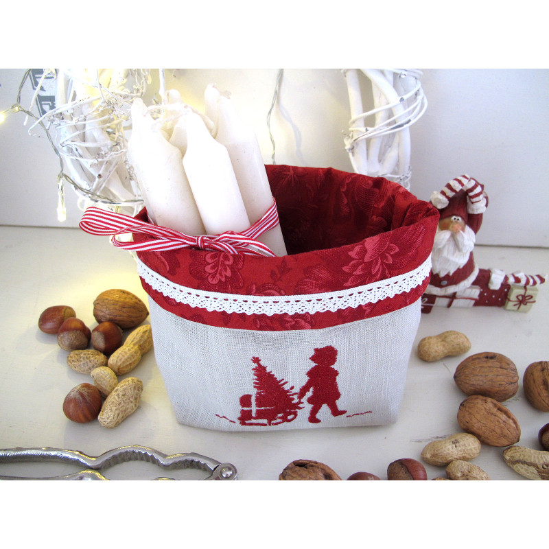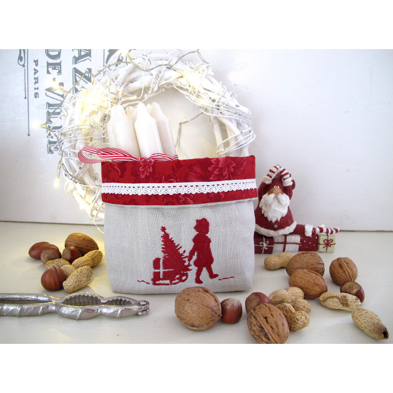 hier ein ganz entzückender Stoffkorb für Weihnachten Leinen mit Stickerei. Ein ideales Geschenk befüllt mit Nüssen oder Keksen oder Kerzen.