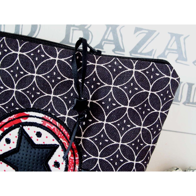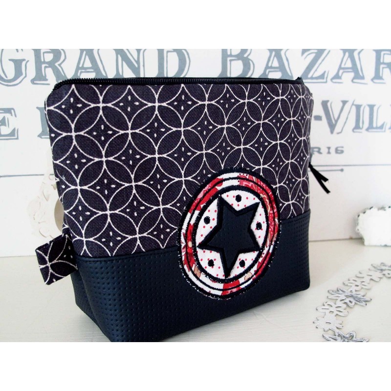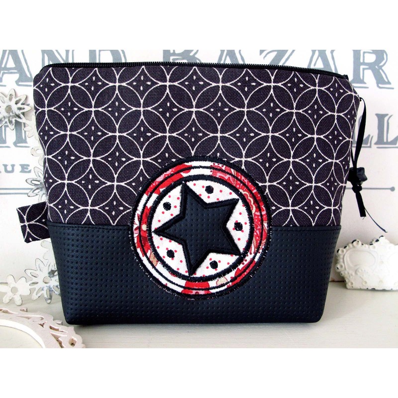 Die Kosmetiktasche ist aus hochwertigem Baumwollstoff /Canvas und Kunstleder gefertigt und mit einer Stern Applikation versehen. Besonders schön das Kunstleder mit Prägedruck. Es ist angenehm weich und griffig. Gibt dem Boden zusätzlich Stand. Ebenso wie die eingearbeitete Vlieseinlage. Innen ist die Tasche mit einem dezent gemustertem Baumwollstoff gefüttert.