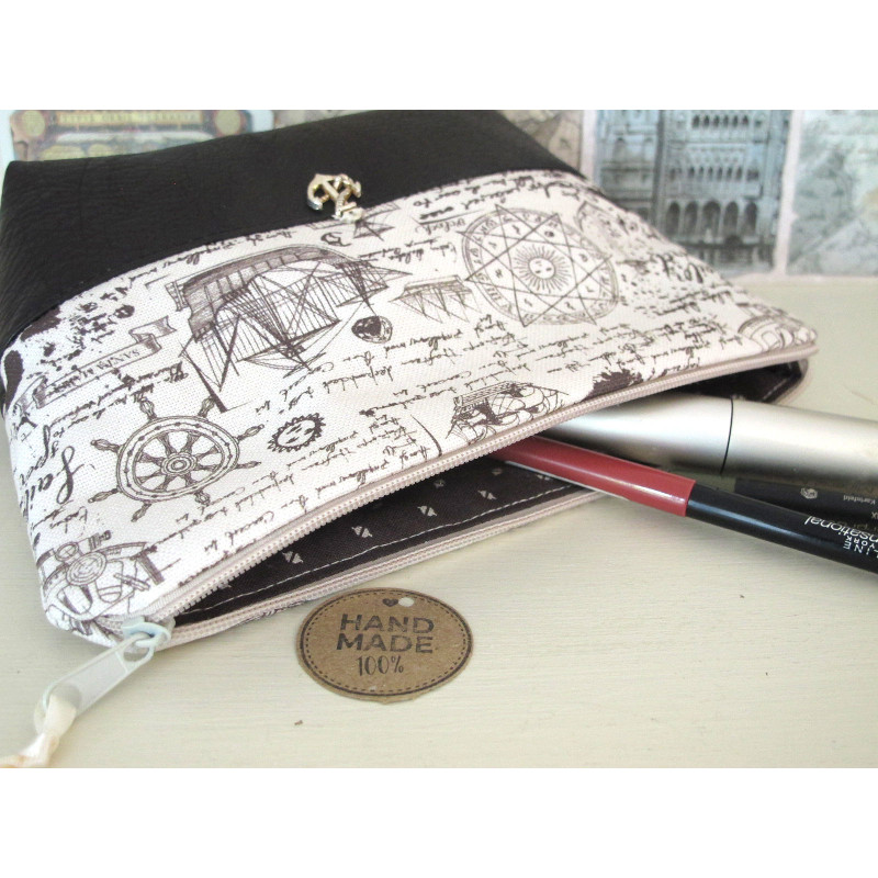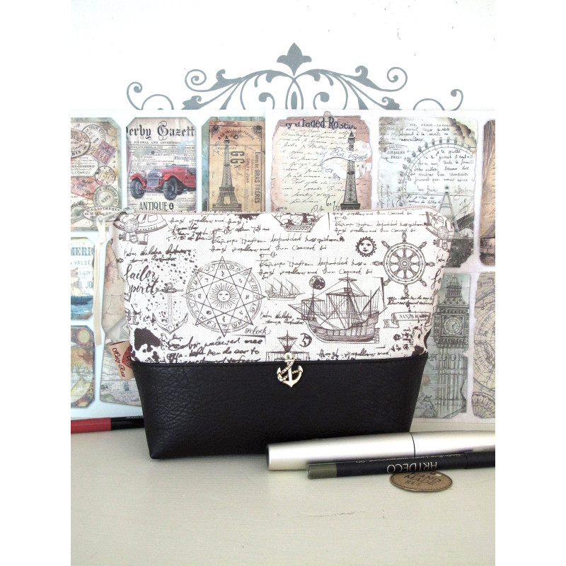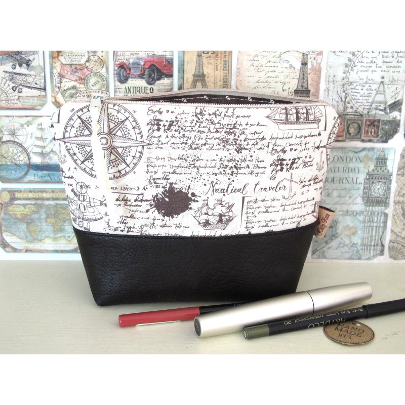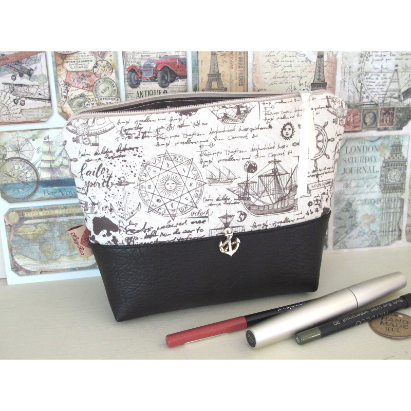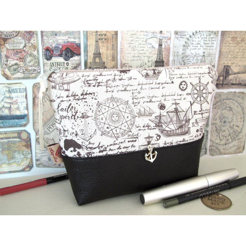 Die Kosmetiktasche ist aus hochwertigem Baumwollstoff /Canvas und Kunstleder gefertigt. Das Kunstleder gibt dem Boden zusätzlich Stand. Ebenso wie die eingearbeitete Vlieseinlage. Innen ist die Tasche mit einem klein gemusterten Stoff aus Baumwolle gefüttert. Ein kleines Anker aus Metall ist aufgenäht.