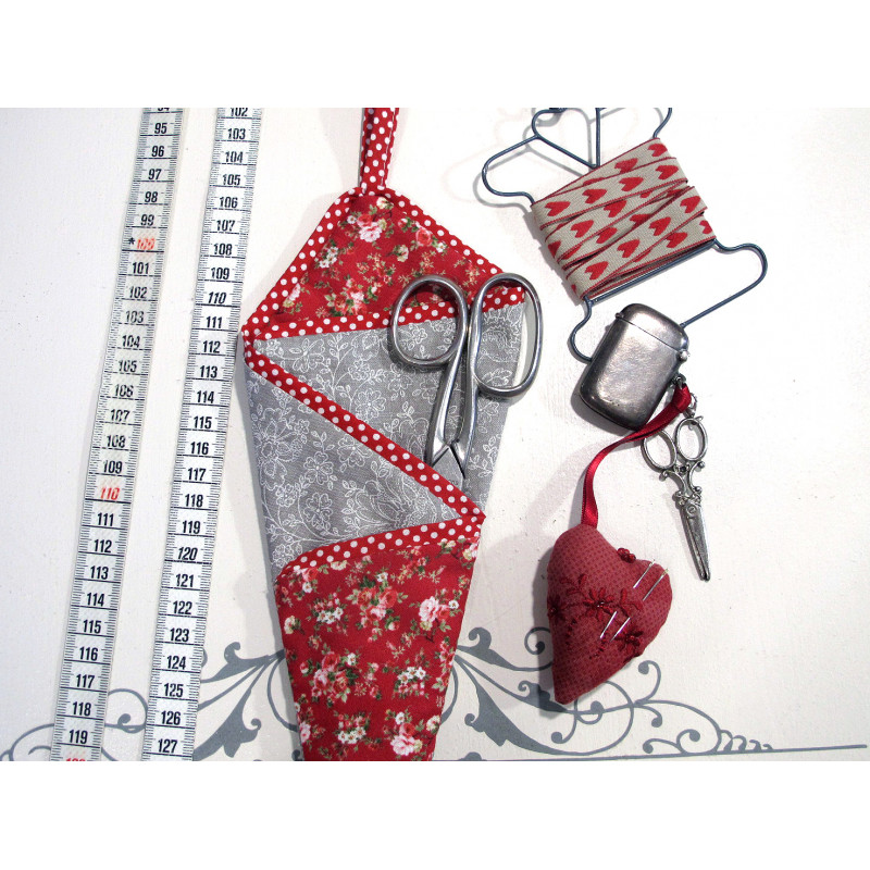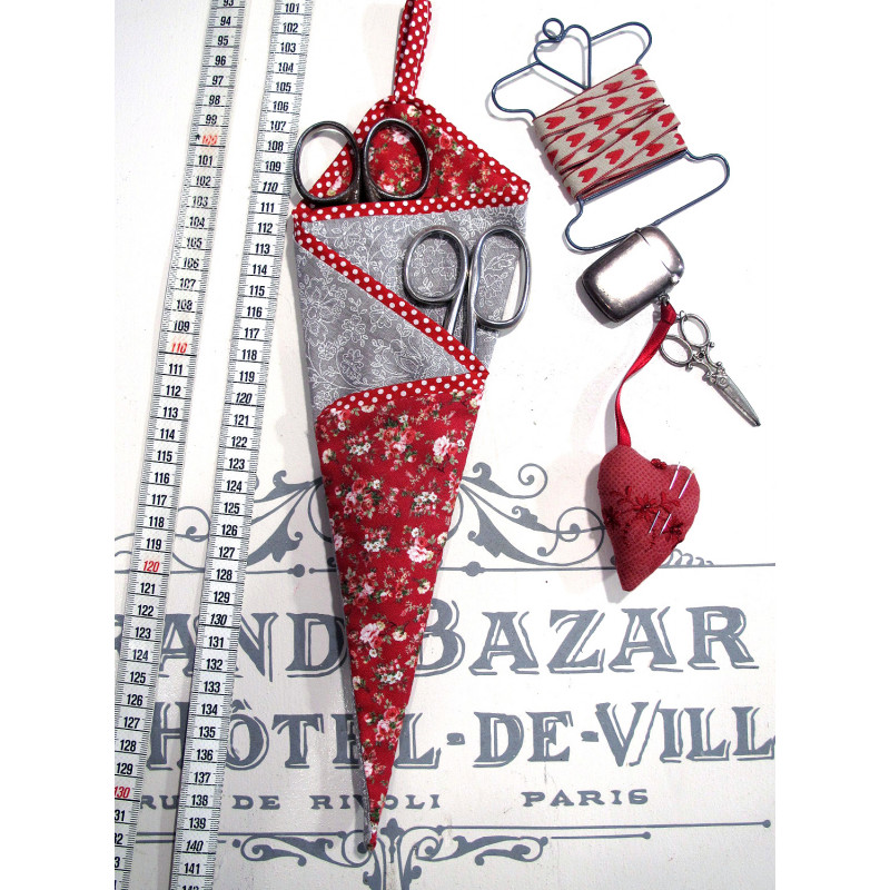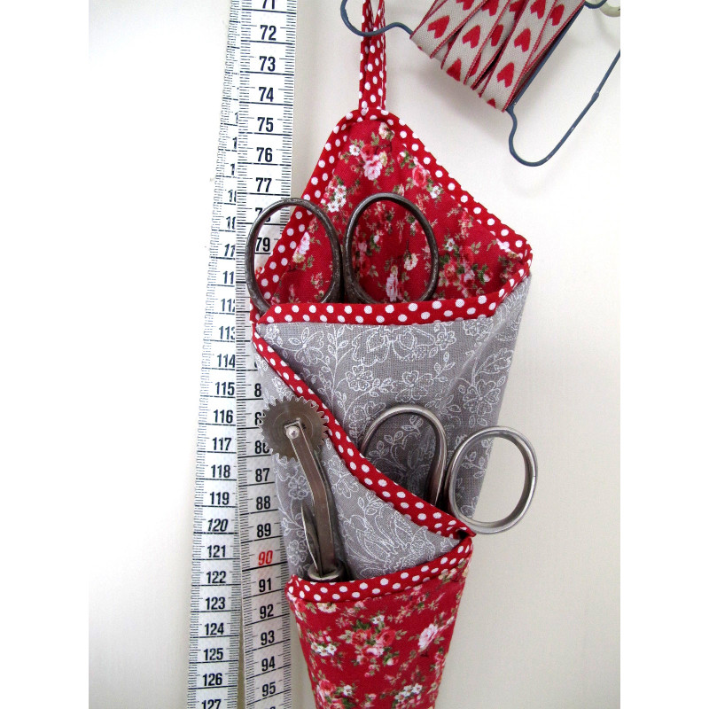 2 Stoffe und Vlies im DIN-A4-Format zuschneiden. Das Vlies auf einen der beiden Stoffe aufbügeln. Die Stoffe rechts auf rechts legen und an zwei Kanten die Borte zwischen den Stoffen positionieren. Restborte zur Schlaufe legen und oben an der Spitze ebenfalls zwischen die Stoffe legen. Dann alles mit Nadeln fixieren/ stecken. Rundum zusammennähen und eine Wendeöffnung belassen. Umdrehen, die Wendeöffnung schließen. Einmal gut bügeln und nach der Vorlage falten. An den langen Seiten mit feinen Stichen nähen oder mit der Maschine knappkantig feststeppen.