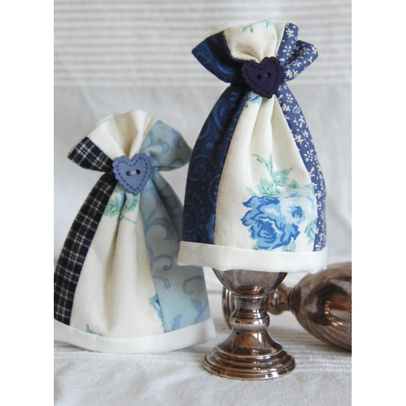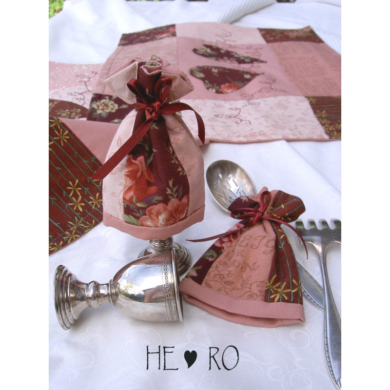 Die 4 Außenteile jeweils an der Längsseite aneinander nähen und die Nähte auseinander bügeln. Oberstoff und Innenseite + Vlies rechts auf rechts legen. Das Futter ist 2 cm länger als Oberstoff und Vlies. Nun an der oberen Kante absteppen. Die Naht auseinander bügeln. Die Arbeit einmal nach links falten. Darauf achten, dass die rechte Seite nach innen zeigt. Nun die Seitennaht an Oberstoff und Futter in einem Zug absteppen. Dabei das Vlies mitfassen. Die Arbeit wenden. Futter nach innen ziehen. Dies schaut nun unten heraus und wird nach außen umgeschlagen und auf dem Oberstoff angenäht. Dafür ca. 0,5 cm einschlagen. Mit einem Quiltgarn oder ähnlich festem Faden 2,5 cm vom oberen Rand entfernt mit Vorstichen nähen. Zum Kräuseln anziehen und gut verknoten. Zur Zierde eine Satinrose, Schleife oder Knopf annähen. Fertig