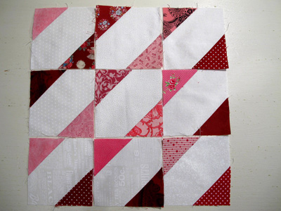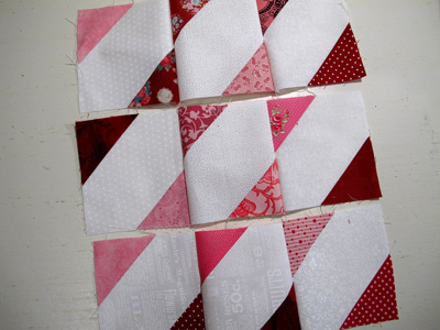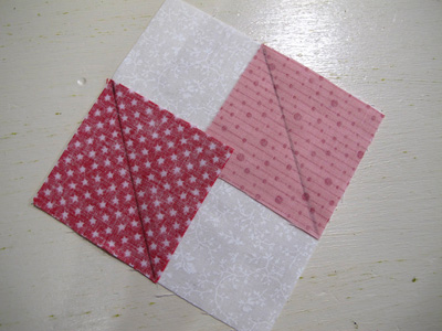 die so entstandenen Ecken nach außen gebügelt. Mit allen Quadraten ebenso verfahren |