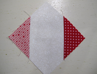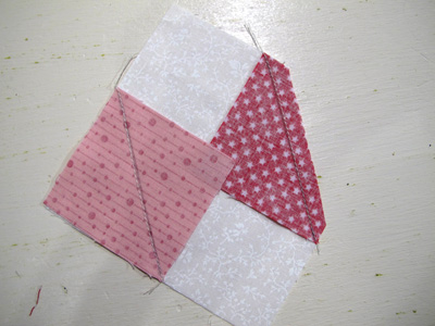 auf der Diagonalen genäht und nahtzugabenbreit neben der Naht den Stoff weggeschnitten. Die andere Ecke ebenso gearbeitet | |