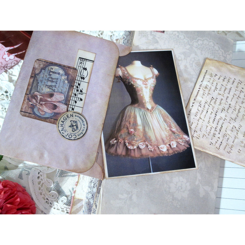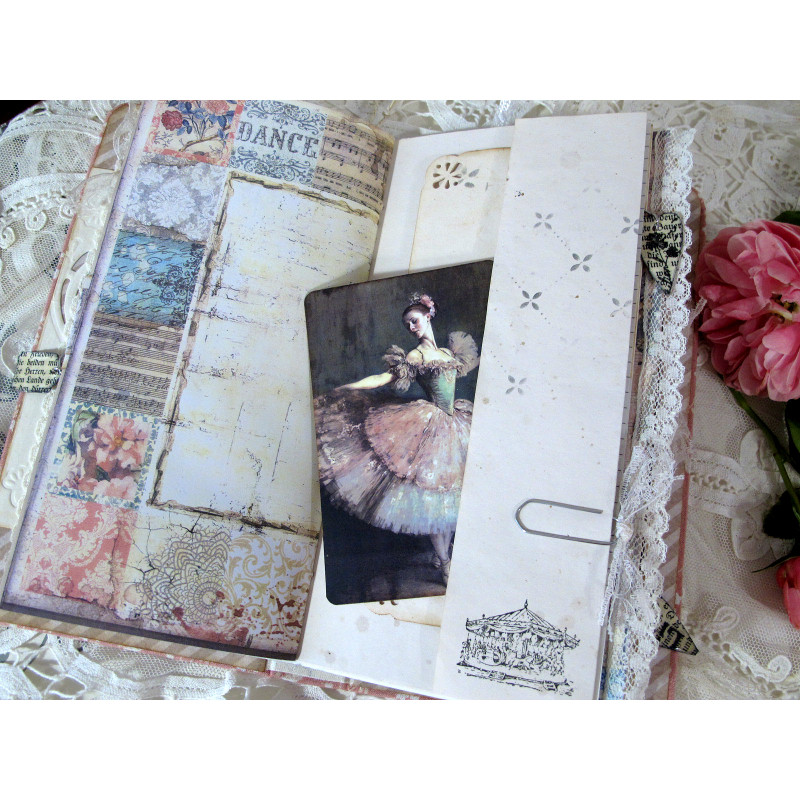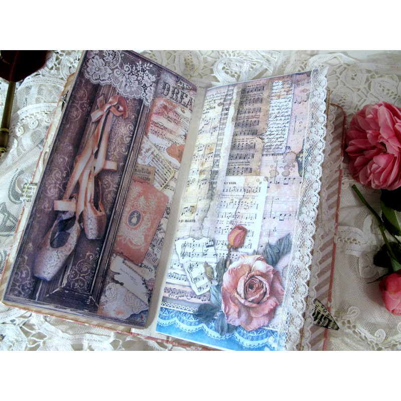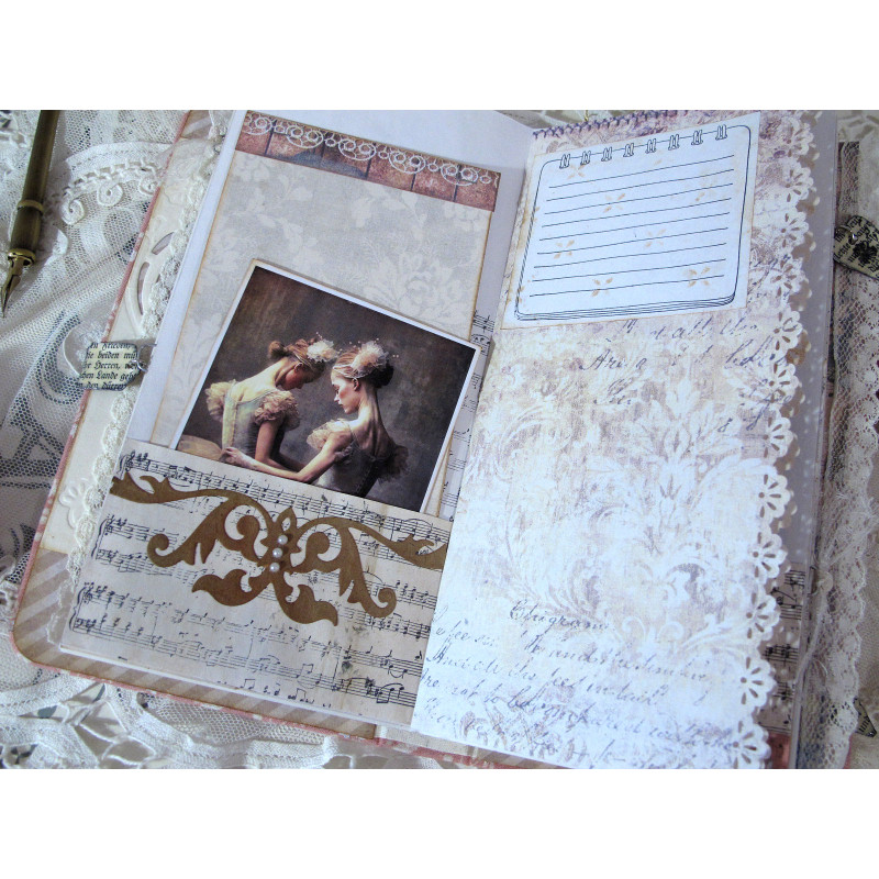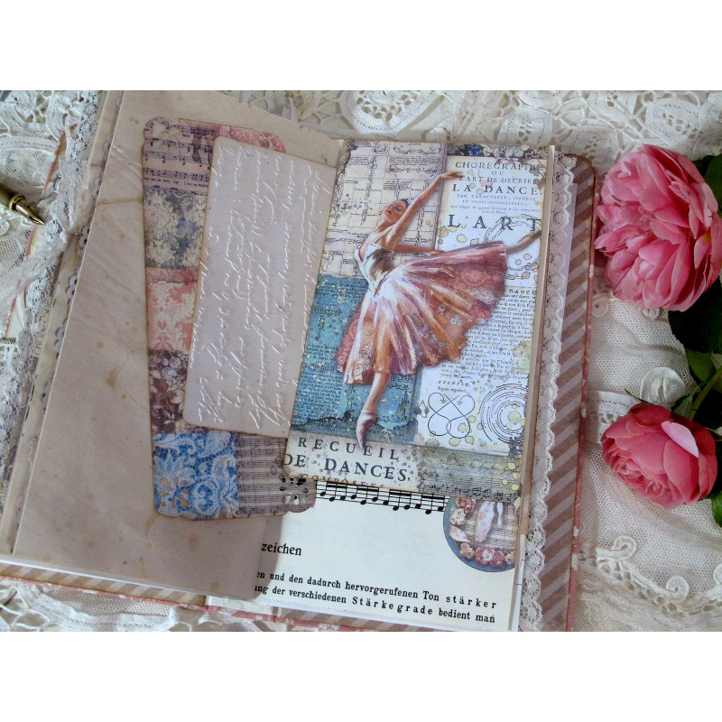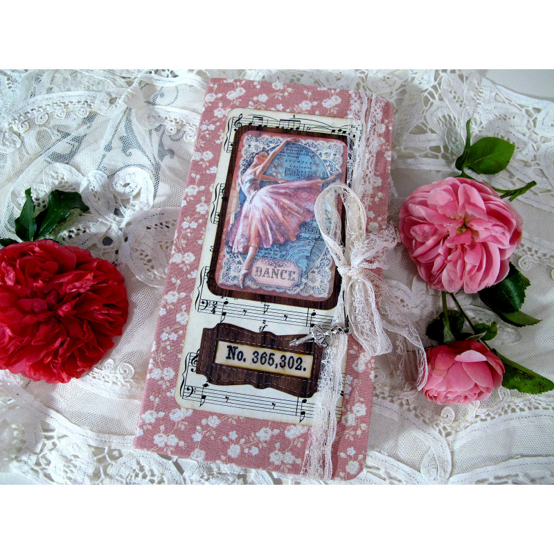 Das Hardcover wurde mit einem geblümten Baumwollstoff bezogen. Die Vorderseite mit einer Ballerina vor einem Notenblatt gestaltet und zum Schutz mit Klarlack überzogen. Ein Spitzenband dient zur Deko sowie zum Schließen (damit nichts herrausfallen kann).