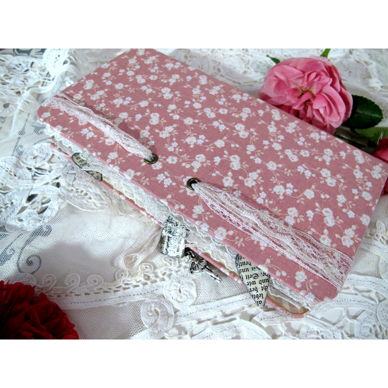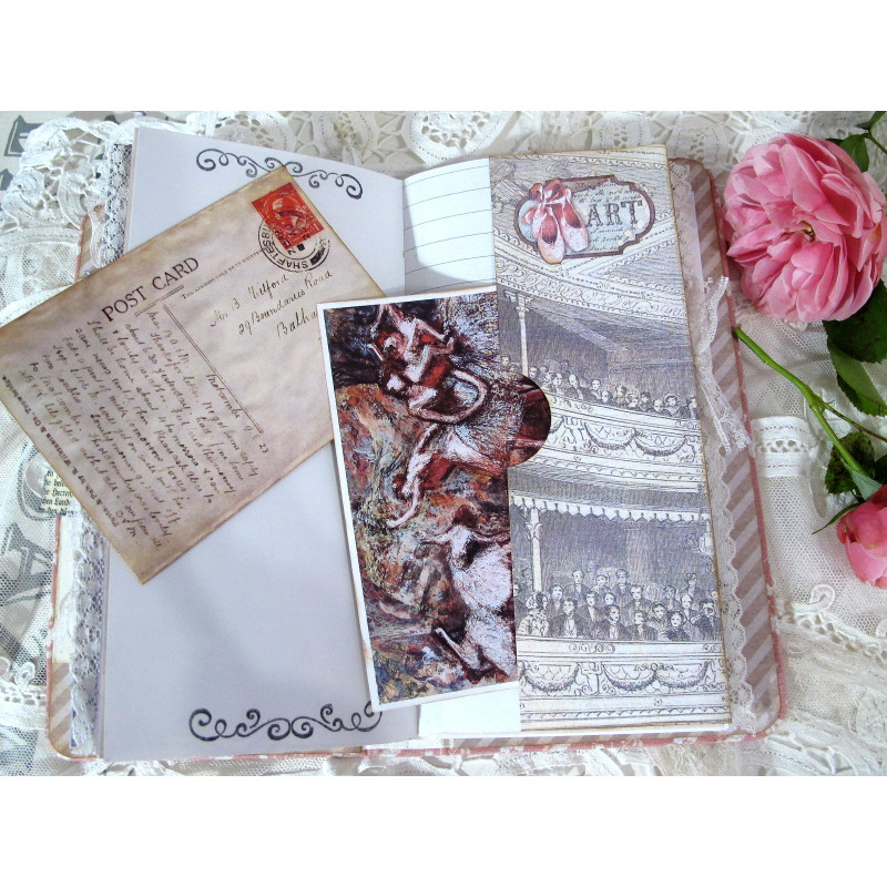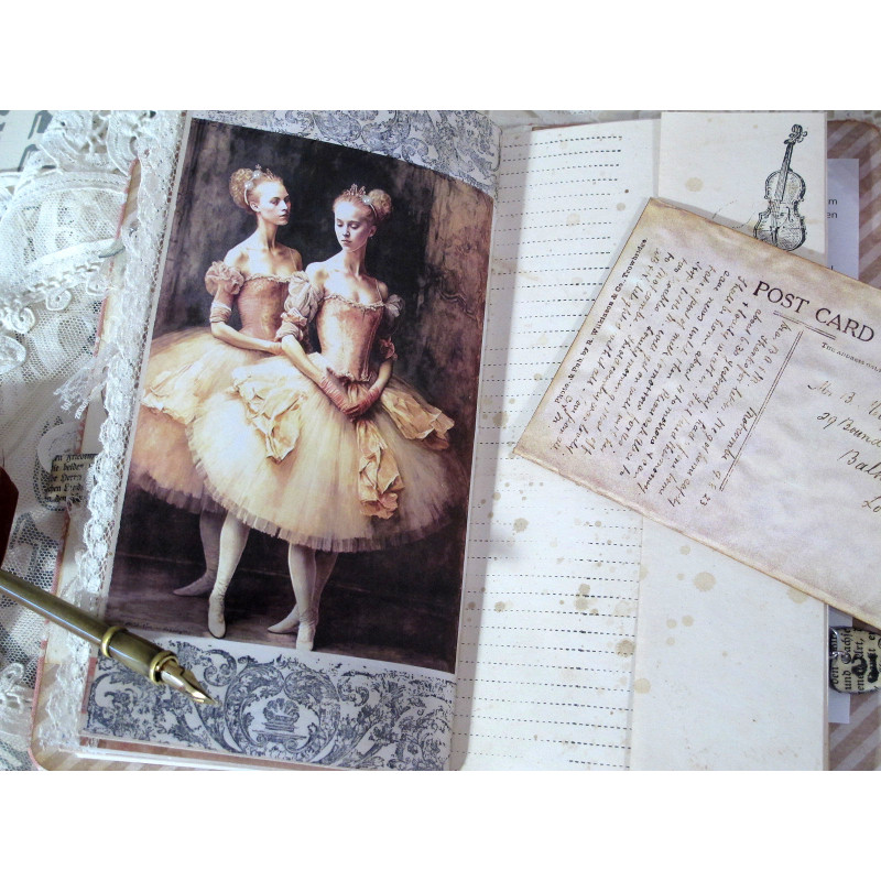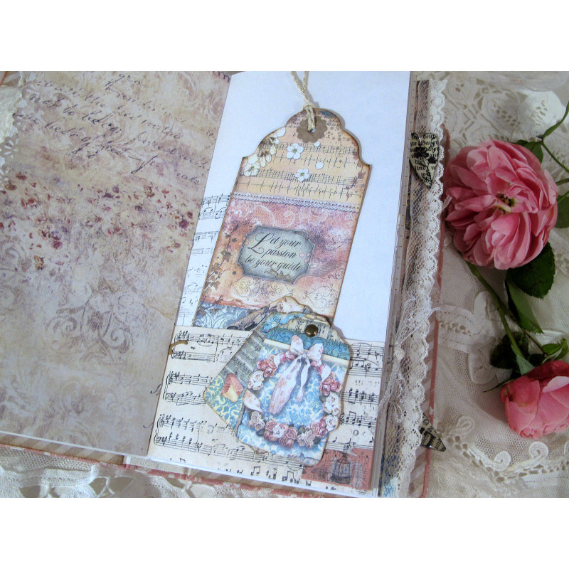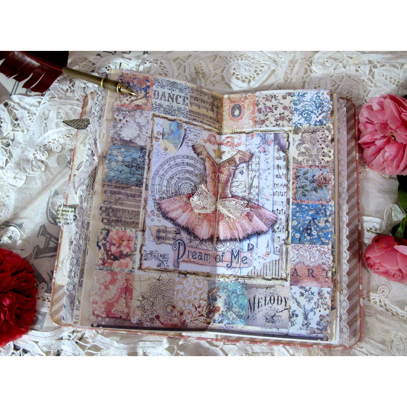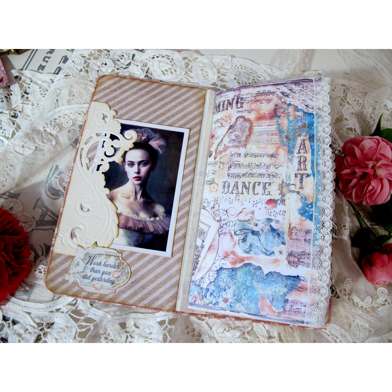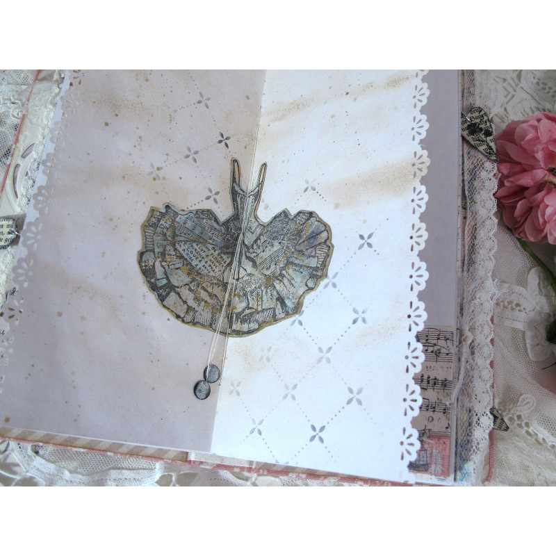 Das Hardcover wurde mit einem geblümten Baumwollstoff bezogen. Die Vorderseite mit einer Ballerina vor einem Notenblatt gestaltet und zum Schutz mit Klarlack überzogen. Ein Spitzenband dient zur Deko sowie zum Schließen (damit nichts herrausfallen kann).