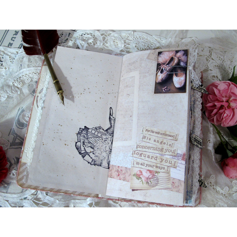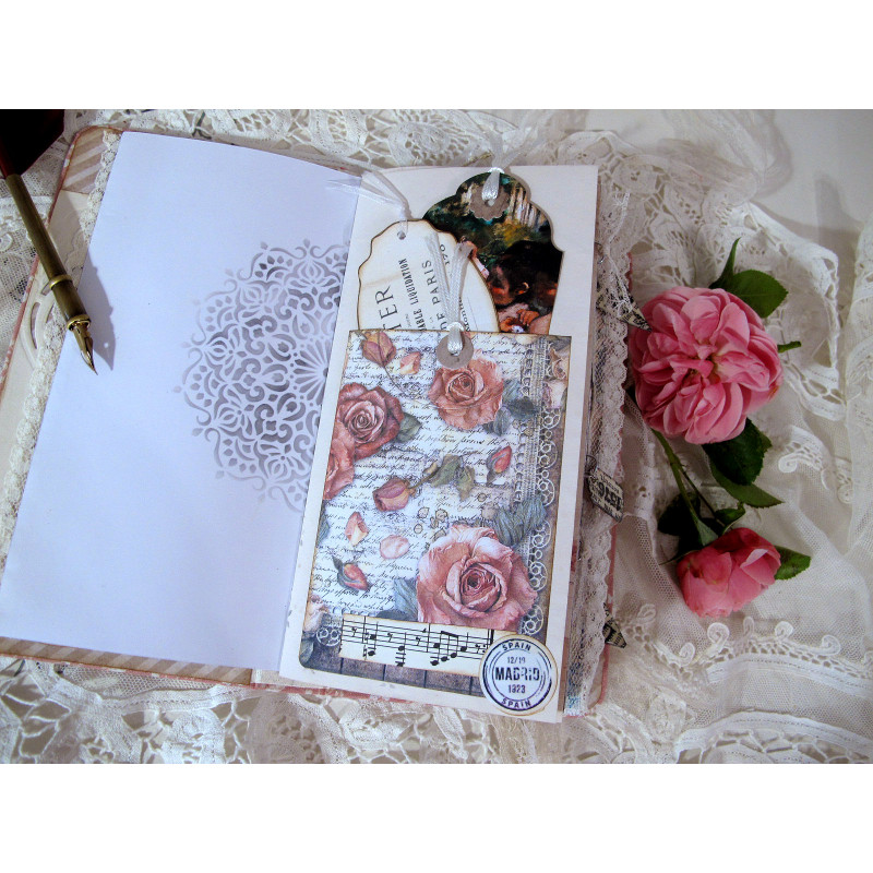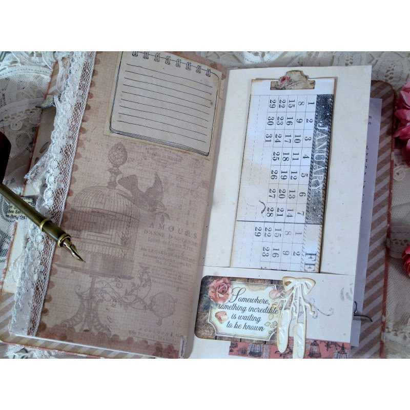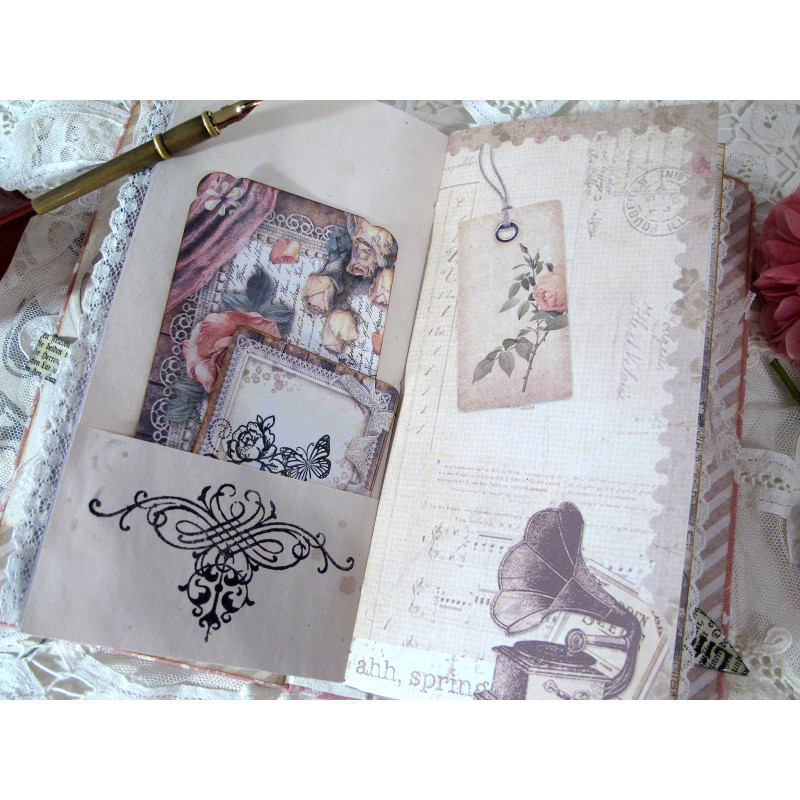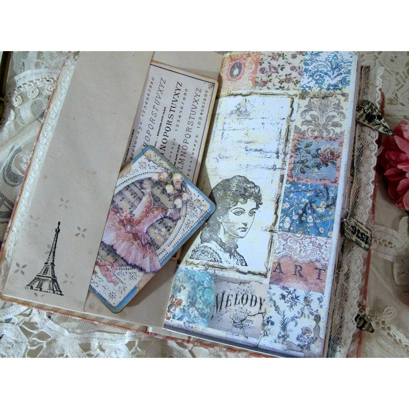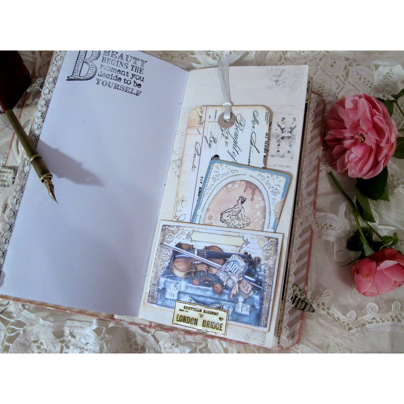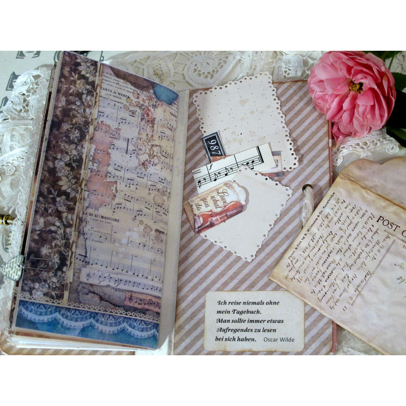 Die einzelnen Seiten sind ein Mix aus verschiedensten Papieren (zum Teil mit Tee oder Kaffee gefärbt), Notenseiten, digitalen Prints, Kalenderblättern, Buchseiten, Designpapieren, Schulheftseiten........ Diese haben wir weiter verschönert mit kleinen Sprenkeln (zum Teil in Gold), mit Spitzen, Stempeldruck, Washi Tape, Einschubtaschen, Stickern, kleinen Charms. Dazu befinden sich im Buch auf der Rückseite beschreibbare Karten, Tags, Ephemeras, Briefbögen, Blöcke, Briefumschläge. Und ein paar Geheimfächer. Unserer Meinung nach ein MUSS für ein Tagebuch.
