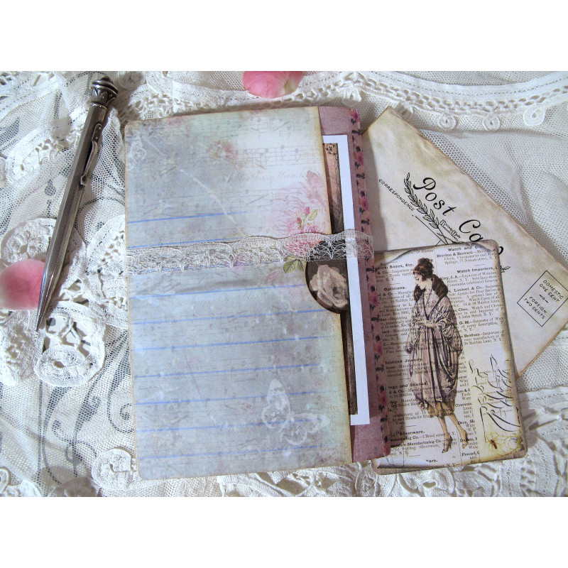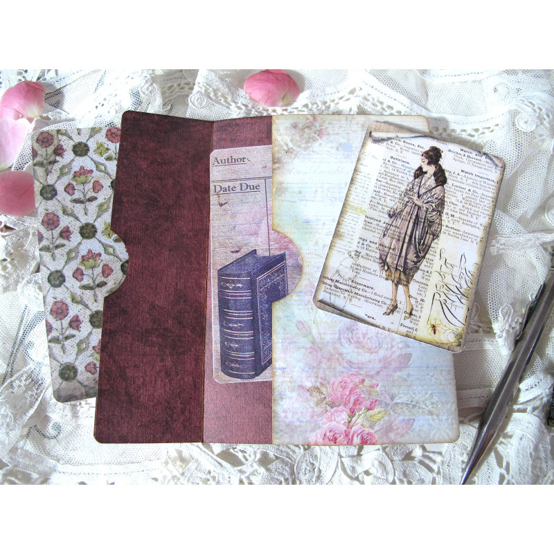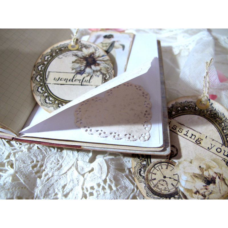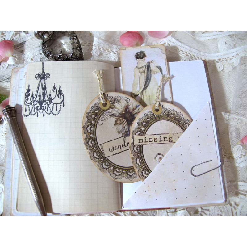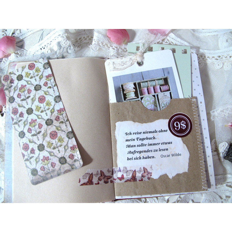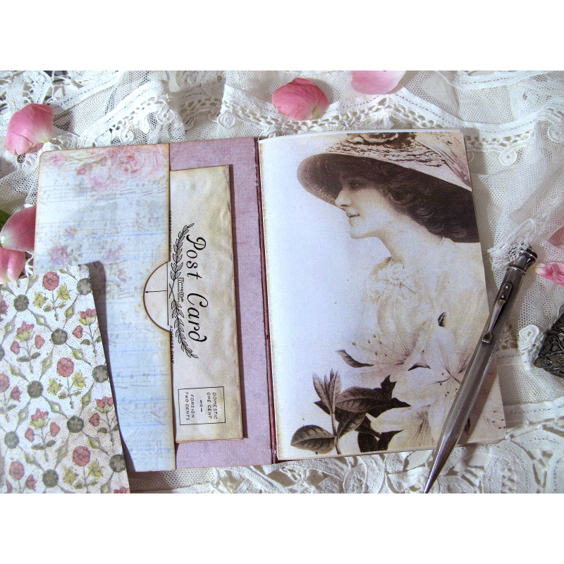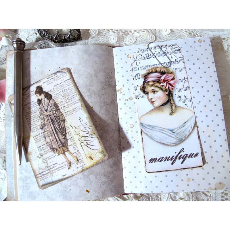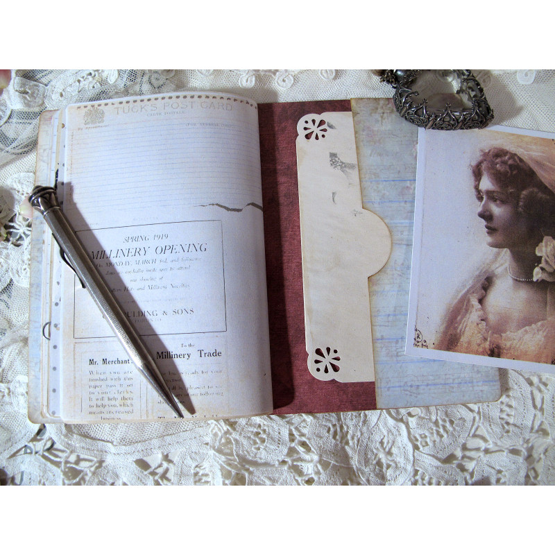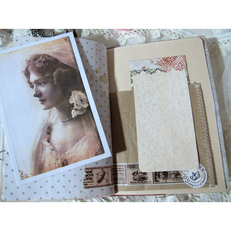 Dieses kleine handliche Buch haben wir mit viel Liebe zum Detail handgefertigt. Das Cover hier ist aus stabilem Karton. Ein Teil der Seiten und Verzierungen sind ein Mix aus romantischen Frauenporträts - darunter auch Lily Elsie. Ebenso auf Karten, Ephemeras, Tags. Diese wiederum sind in Taschen eingeschoben, mit Klammern fixiert oder in einen kleinen Briefumschlag hineingegeben. Einige Seiten sind bewusst neutal gehalten, damit ausreichend Platz zum Beschreiben vorhanden ist. Ein beigefügter Umschlag enthält Deko zum weiteren Ausschmücken.