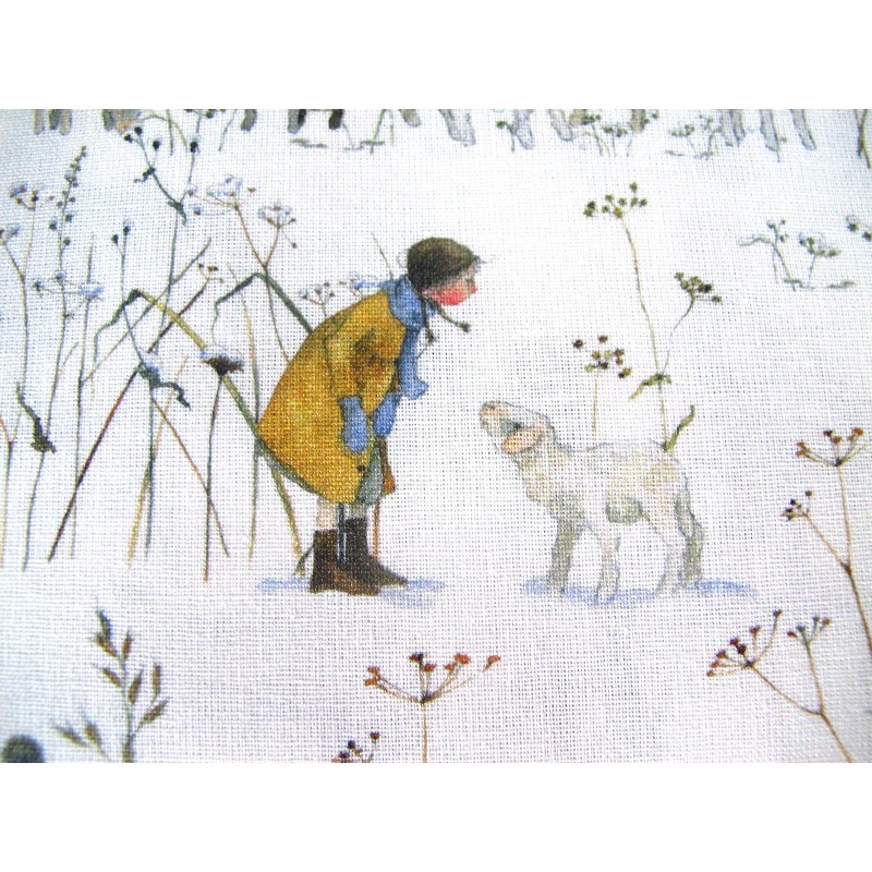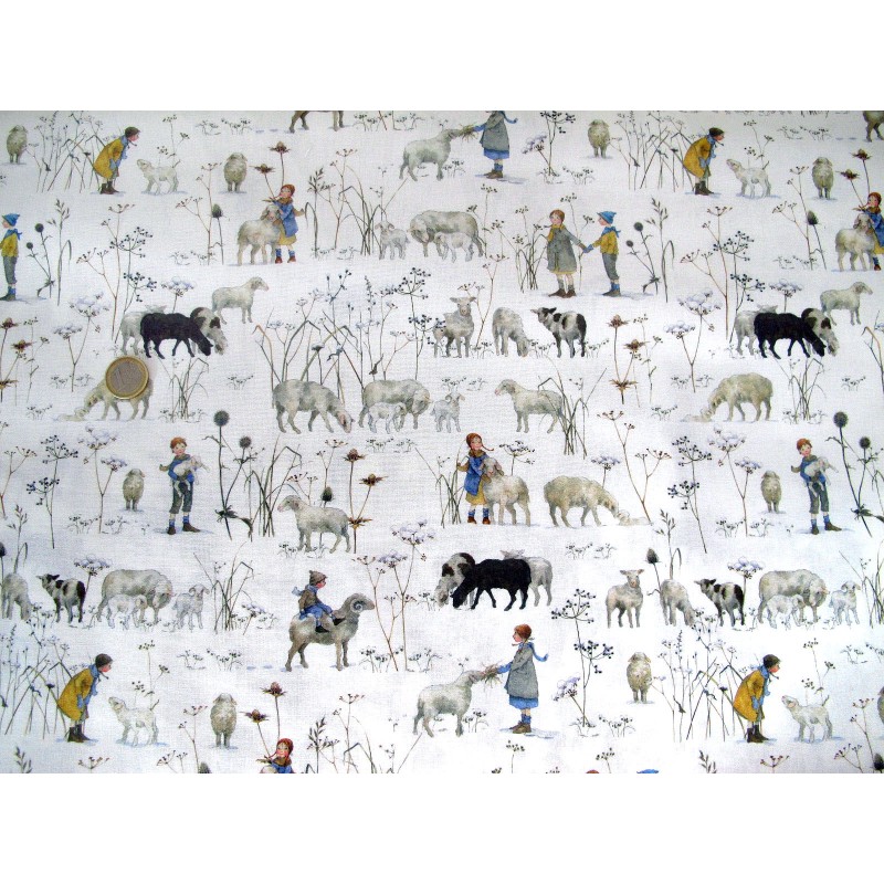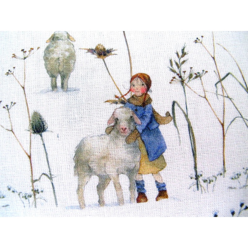 Liebevoll und detailreich gezeichnet von Daniela Drescher. Jungen und Mädchen mit Schafen zwischen Wildblumen mit Schneehaube in beige braun senfgelb blau grau auf gebrochenem weiß. Ein wunderschöner Baumwollstoff für vielerlei Nähprojekte wie Kinderbekleidung, Krabbeldecken, Kissen, Taschen, Beutel. Ein toller Hingucker. Kombiniert mit Leinen oder dezent bedruckten Stoffen kommen die Motive noch besser zur Geltung