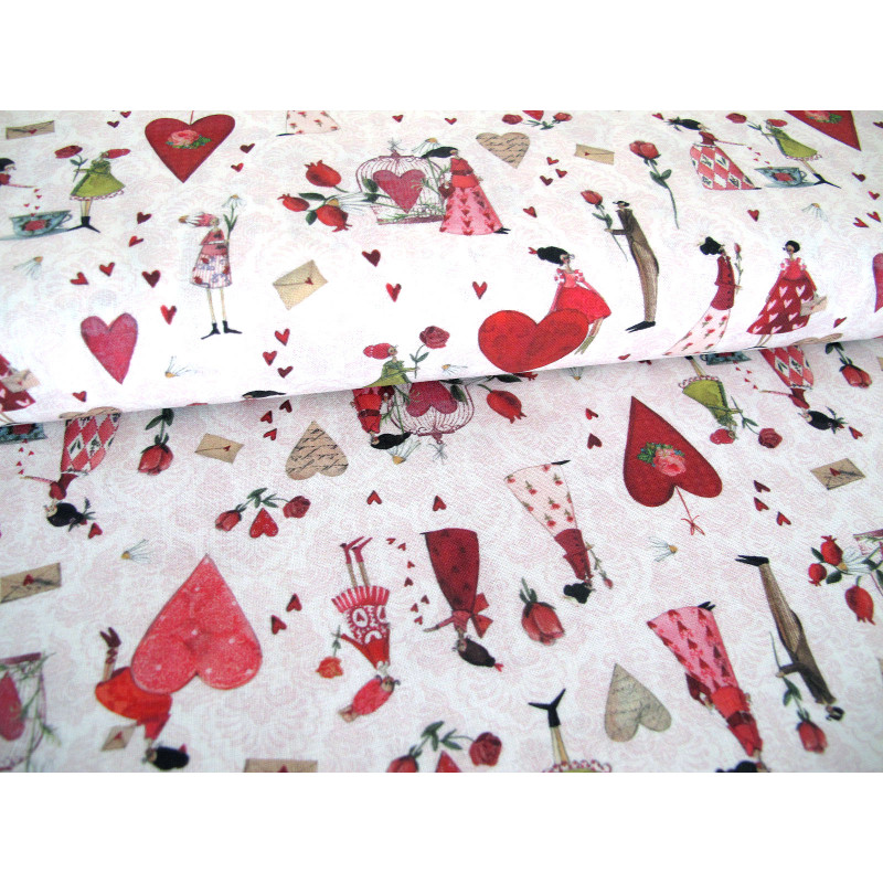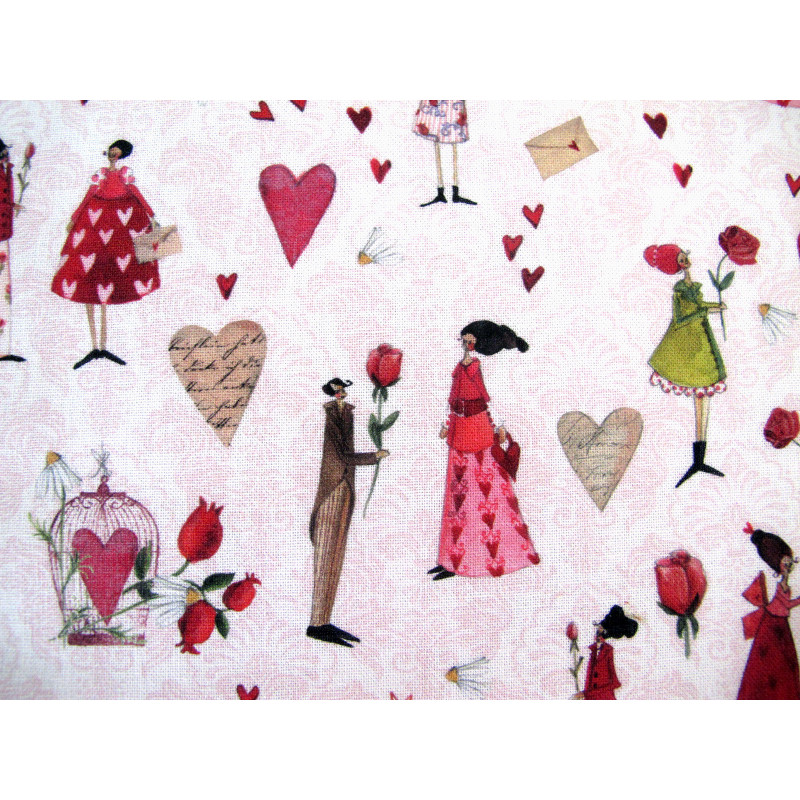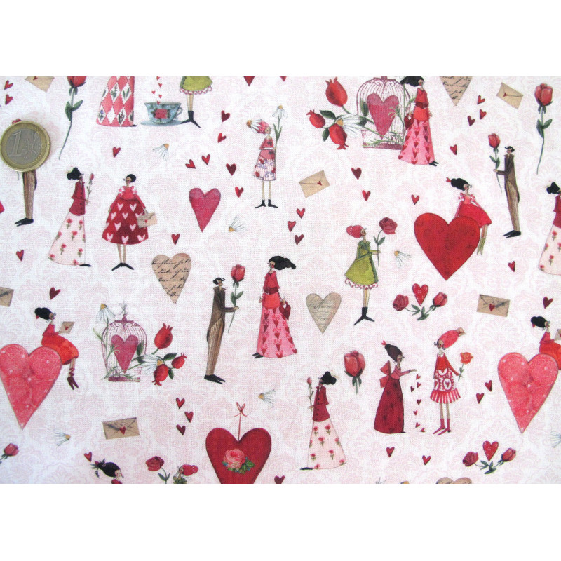 Verliebte zwischen Briefen, großen und kleinen Herzchen sowie Blumen. Im Hintergrund zart rosa Ornamente auf weiß. Liebevoll und detailreich gezeichnet von Silke Leffler. Ein wunderschöner Baumwollstoff für vielerlei Nähprojekte. Ideal für den Valentinstag. Kombiniert mit einem dezent bedruckten Stoff kommen die hübschen Motive noch besser zur Geltung
