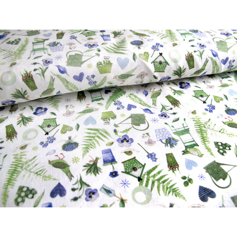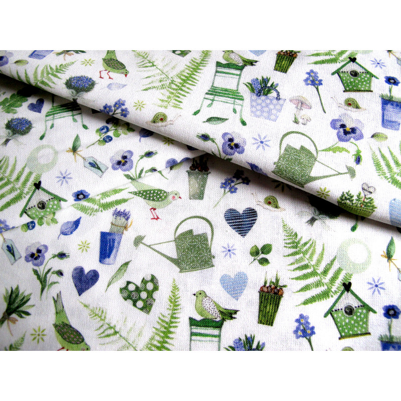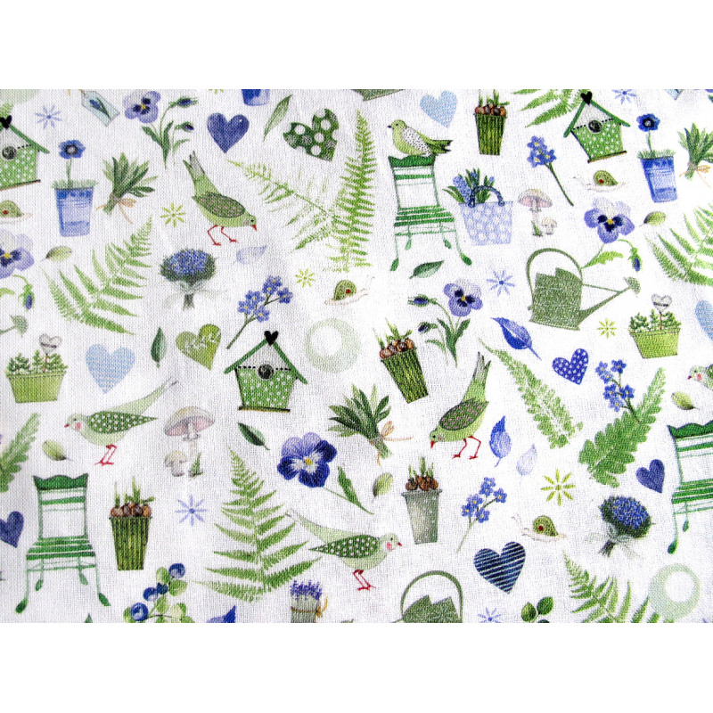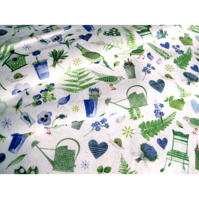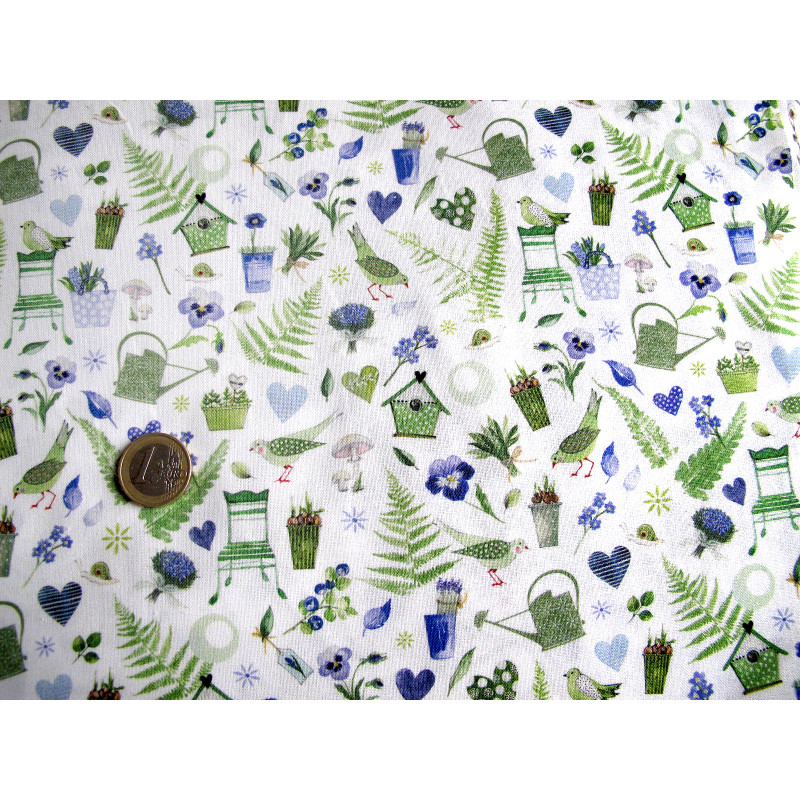 wunderschön und detailreich gezeichnet von Kerstin Heß. Gartenutensilien Vögel Blumen Herzen.......in grün blau auf gebrochenem weiß. Ein herrlicher Frühling- und Sommerstoff. Auch perfekt für Ostern