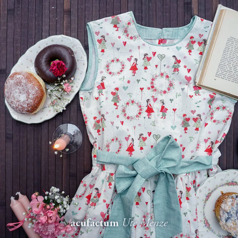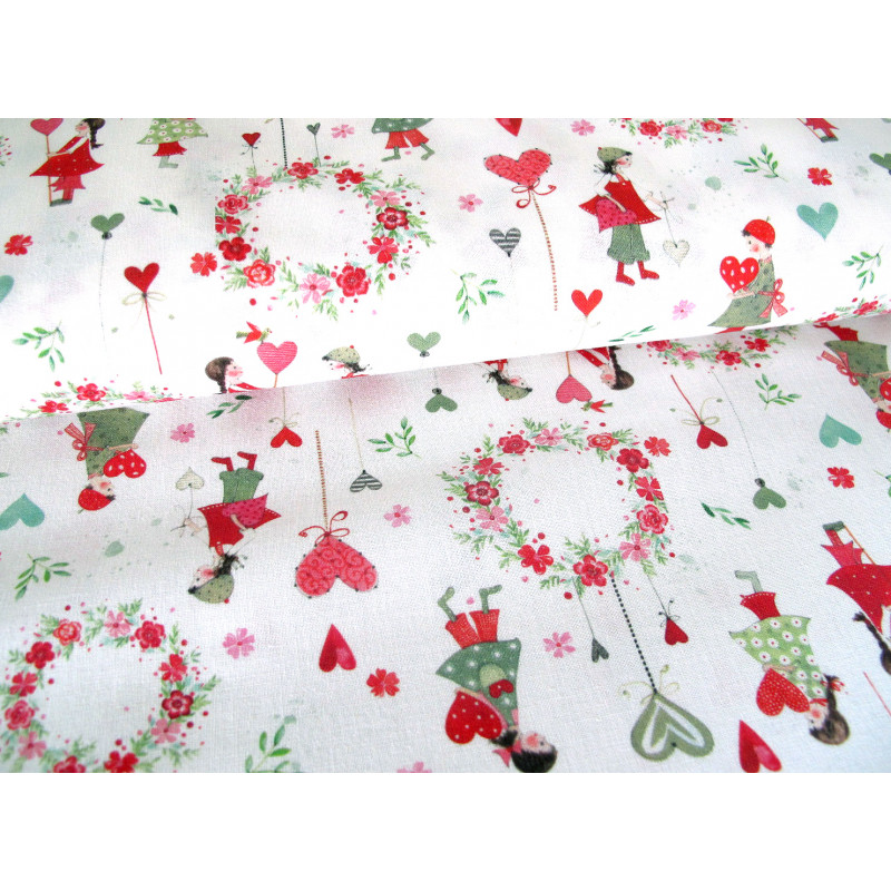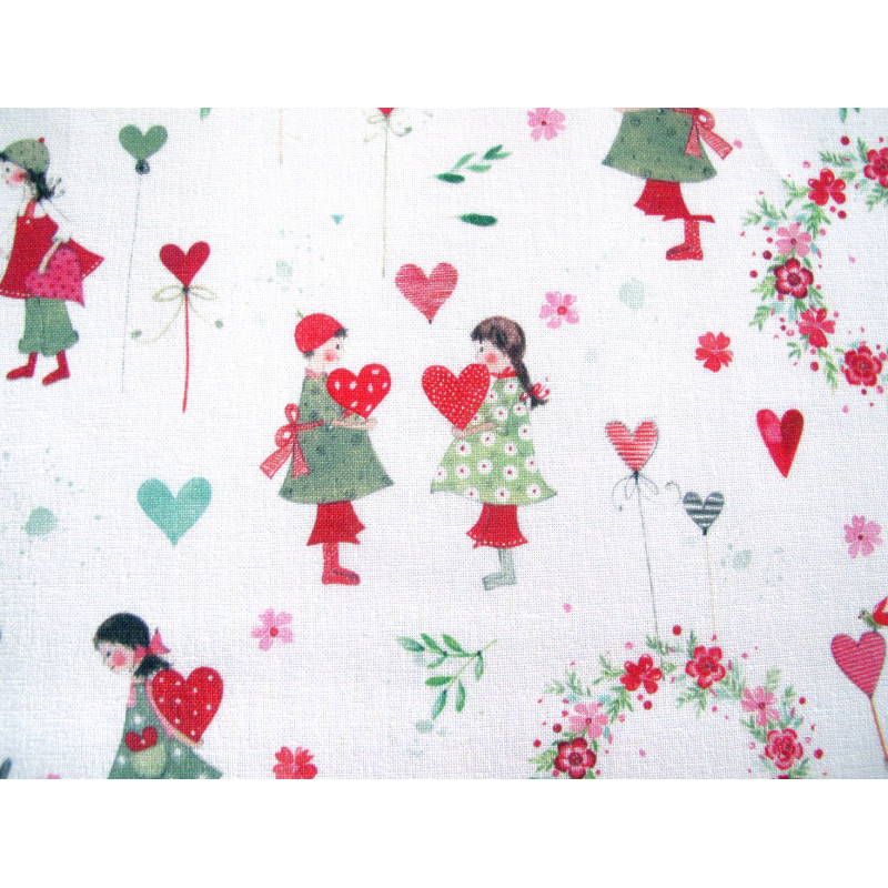 Ein wunderschöner Baumwollstoff bedruckt Kindern und Herzchen zwischen Blumenkränzen in rot rosa und grün auf gebrochenem weiß. Ein ganz entzückender Sommerstoff