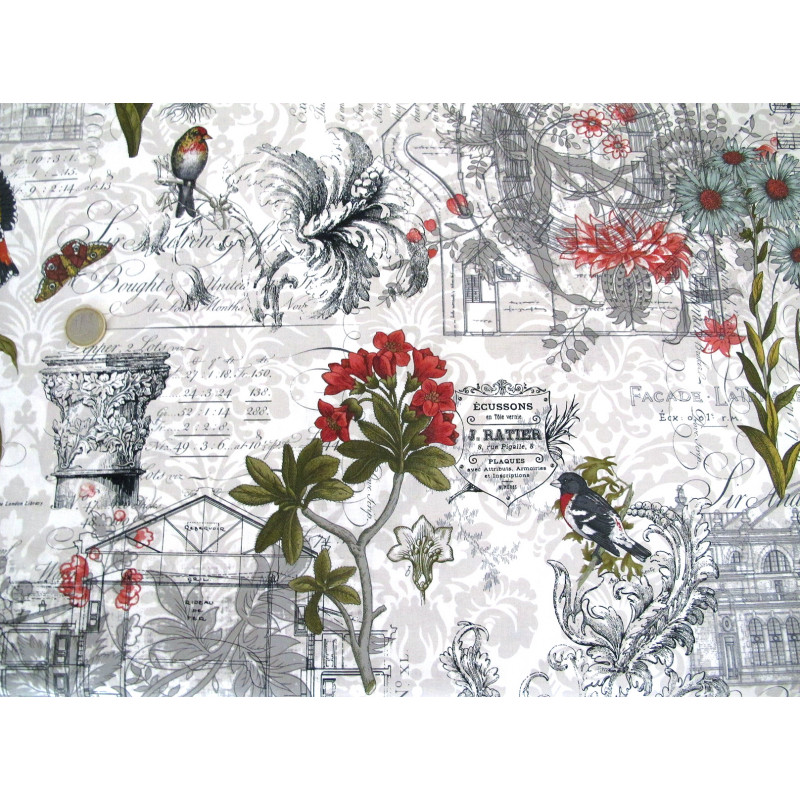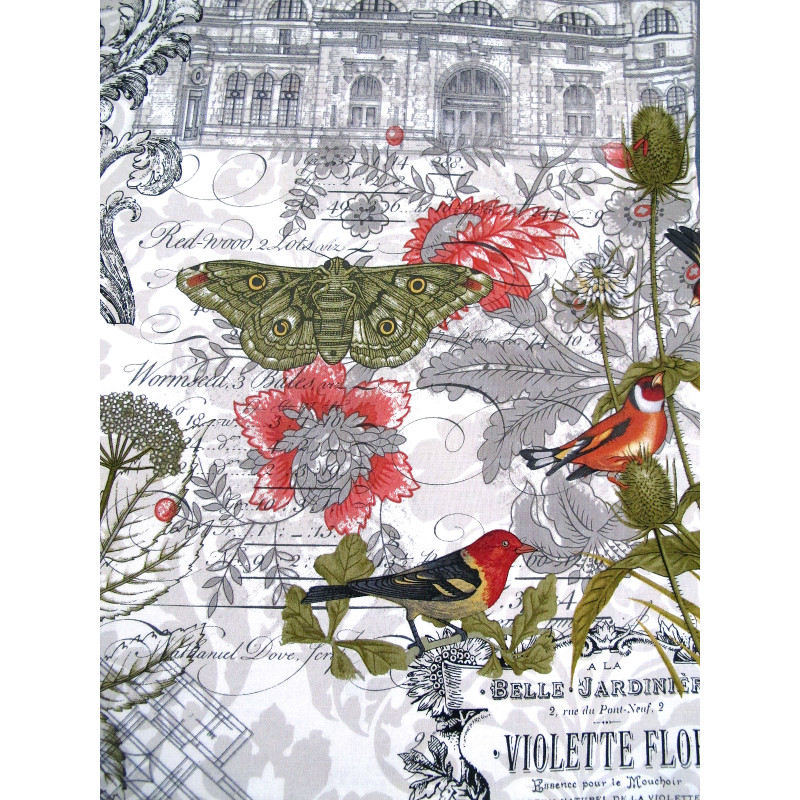 Design: Blumen, Vögel, Schmetterlinge, Gebäude, Säulen, Text ....... auf cremeweiß mit Ornamente in taupe