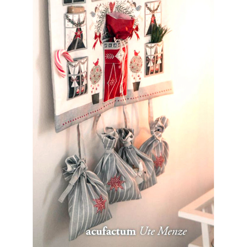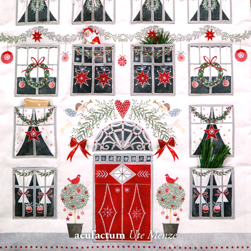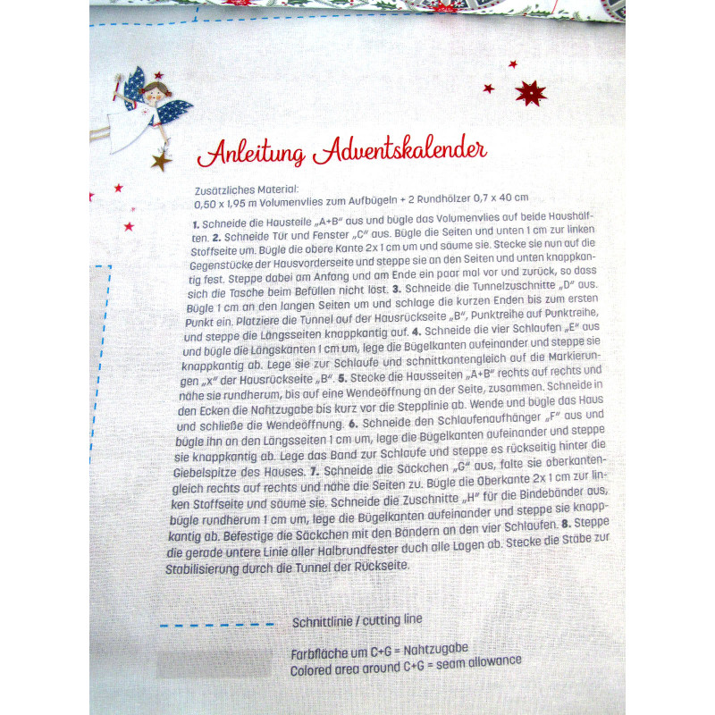 Ein zauberhafter Adventskalender / Weihnachtshaus zum selber nähen. Ein toller Hingucker der jedes Jahr aufs neue erfreut - also wirklich nachhaltig - zum befüllen mit kleinen Überraschungen oder persönlichen Botschaften. Dazu gibt es noch 4 Säckchen. Mit Geschick und Fantasie kann das Panel als Mittelteil für ein Paid verwendet werden oder aus dem Haus ein dickes großes Kuschelkissen gefertigt werden.Das Stoffpanel enthält Schnittlinien für schnelles und einfaches Nähen sowie eine Anleitung zur Anfertigung des Adventskalenders in deutsch und englisch. Die 19 Fenster und 1 Tür werden als Taschen aufgenäht. Die 4 Säckchen können angehängt werden. Ergibt 24 Möglichkeiten für kleine Überraschungen.Zusätzlich wird noch Volumenvlies von 50 x 195 cm benötigt und 2 Rundhölzer von 0,7 x 40