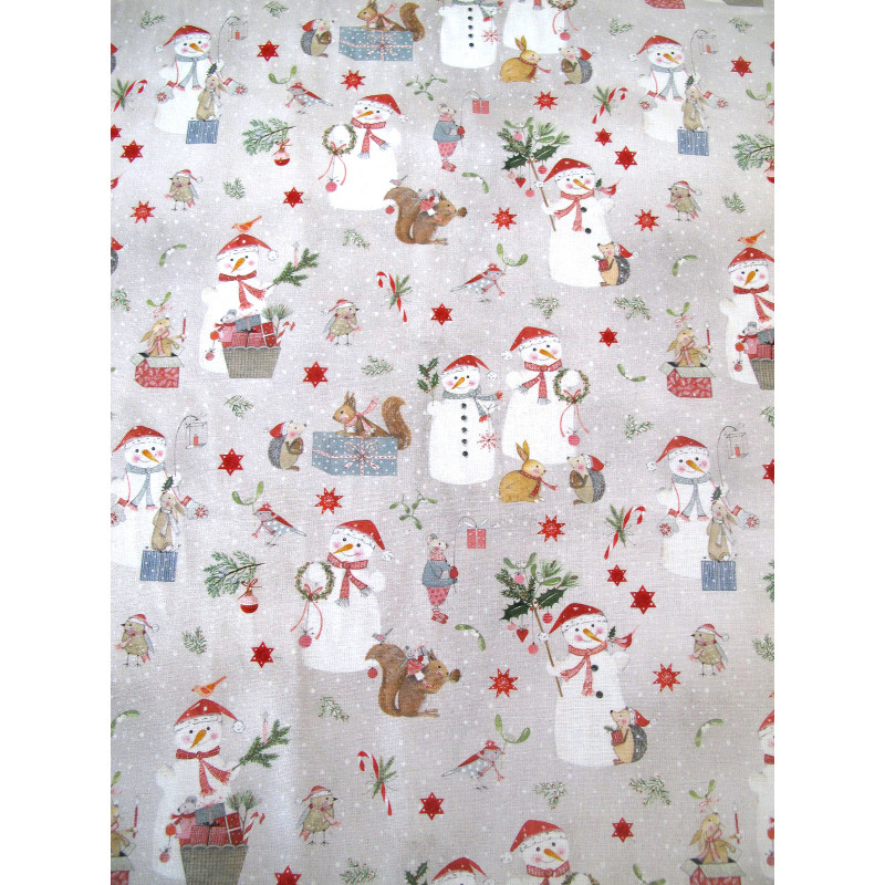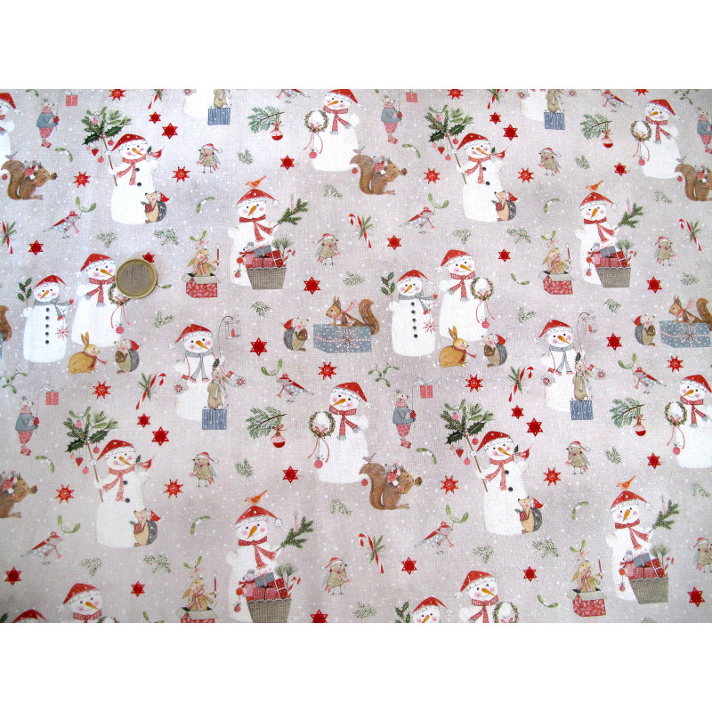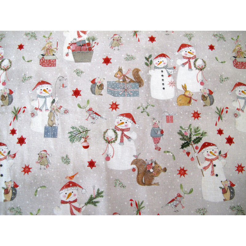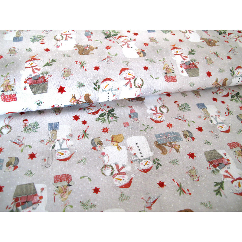 Design: Schneemänner und Tiere mit Zweigen auf taupe hell mit Schneeflocken