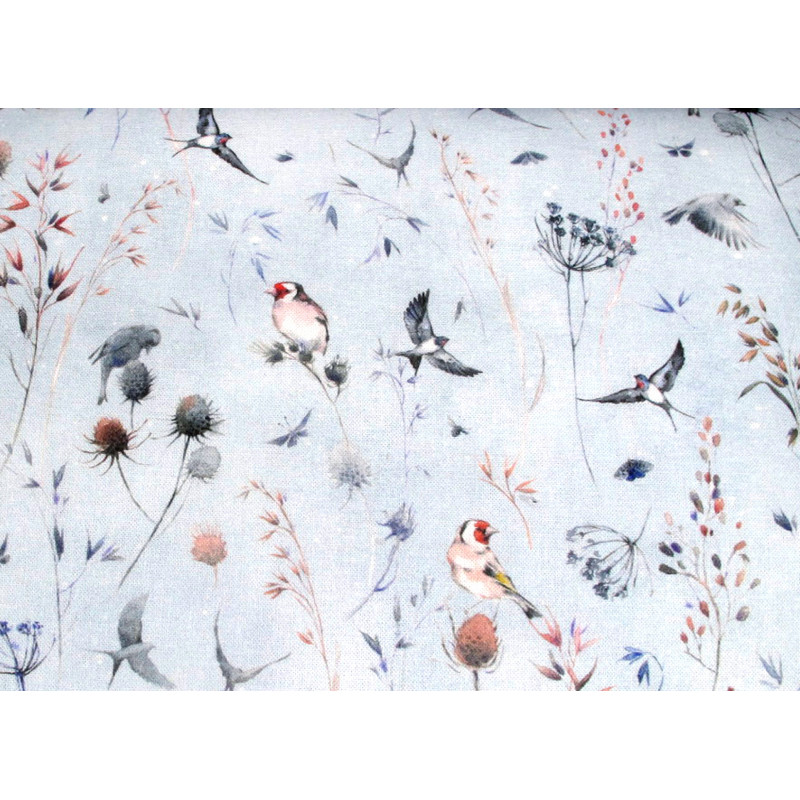 Dieser wunderschöne Baumwolldruck zeigt Schwalben und Distelfing mit zarten Gräsern auf hellblauem Grund - ein sehr hochwertiger Baumwollstoff designed von Sophia Drescher aus der neuen Kollektion My Dear Jane und abgestimmt auf das Neue Buch von acufactum.