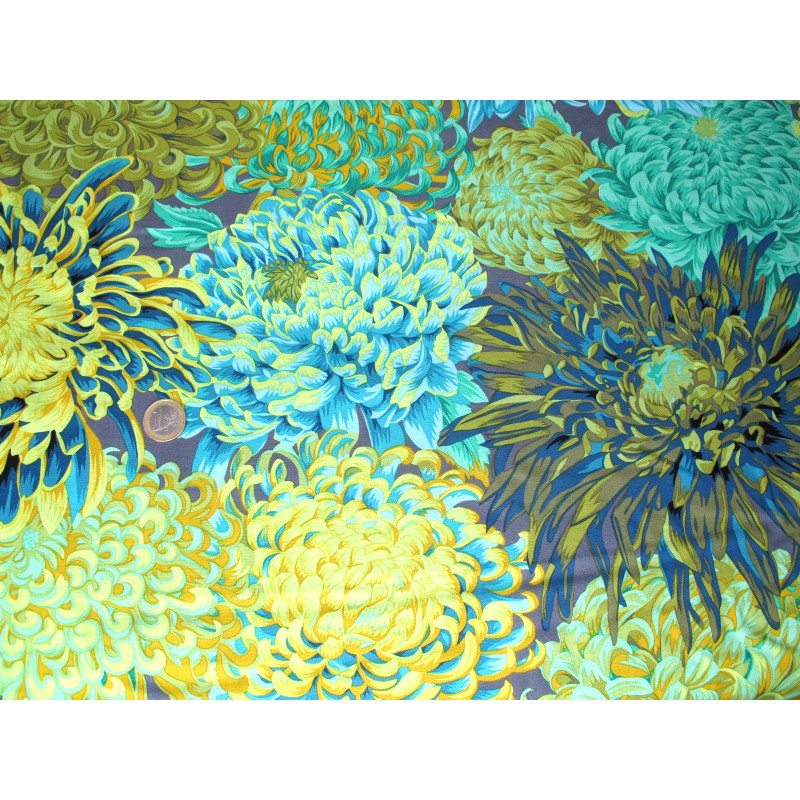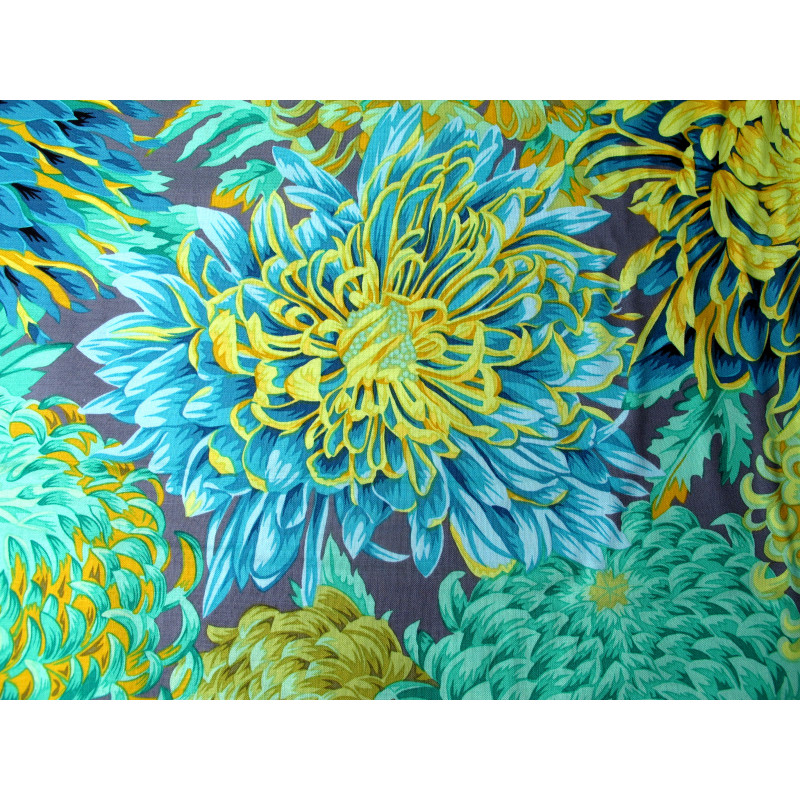 Design: große Chrysanthemen/ Blumen in grün blau gelb türkis auf grauem Grund