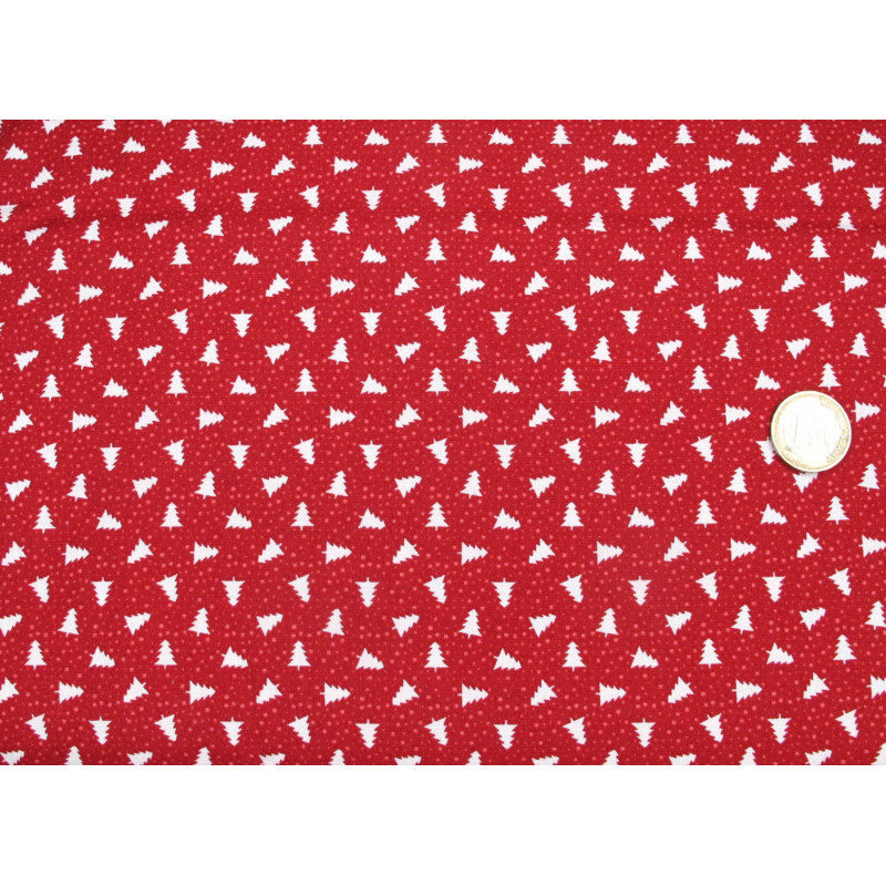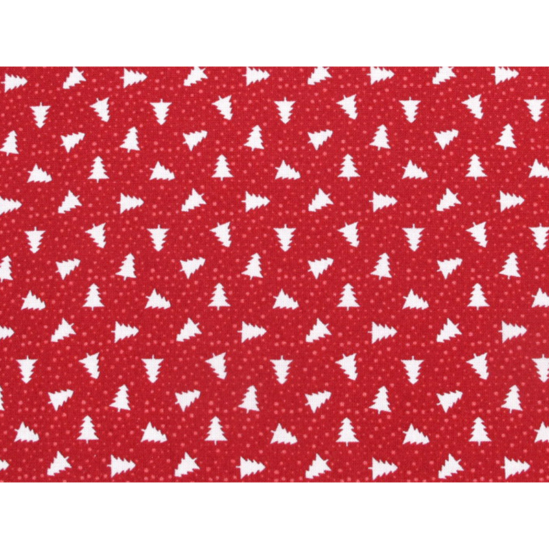 Design: kleine Tannen in weiß zwischen hellroten Punkten auf rotem Grund