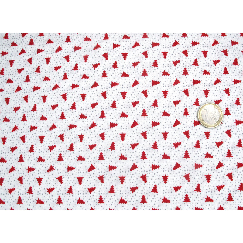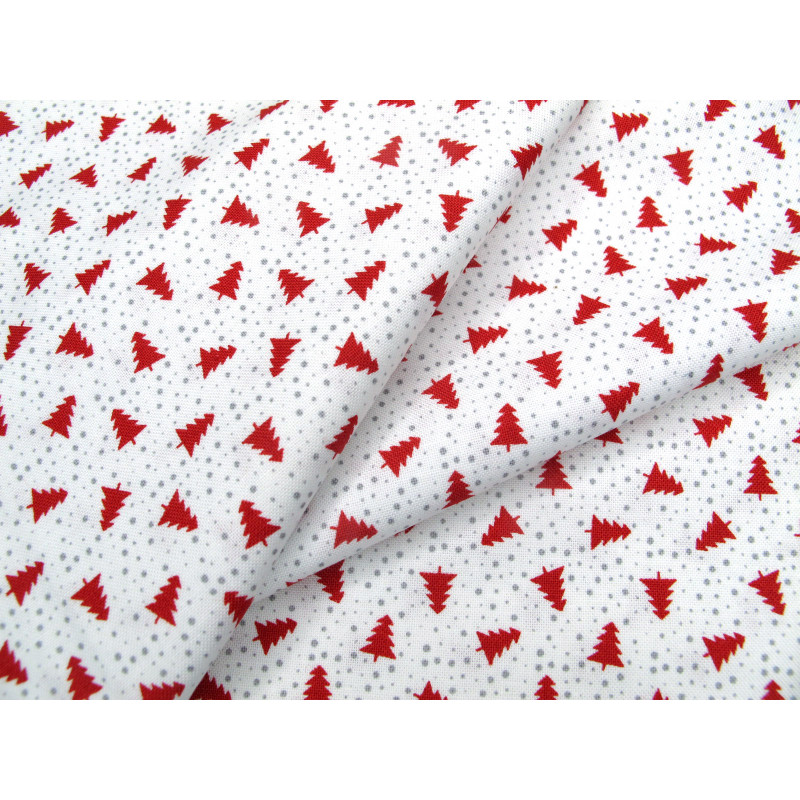 Design: kleine Tannen in rot zwischen hellgrauen Punkten auf weißem Grund