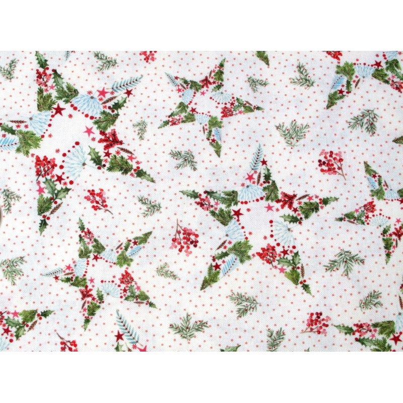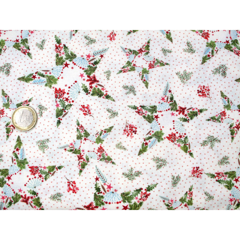Der Baumwollstoff Weihnachtssterne bringt die stille Schönheit des Winters auf ganz besondere Weise zur Geltung. Aus zarten Farnblättern, Tannenzweigen, Beeren und kleinen Blüten entstehen filigrane Sterne, die sich auf einem dezent gepunkteten Untergrund entfalten. Ob für festliche Tischdecken, Geschenkverpackungen aus Stoff, Kissen oder andere Herzensprojekte dieser Stoff lädt dazu ein, die Weihnachtszeit kreativ zu gestalten