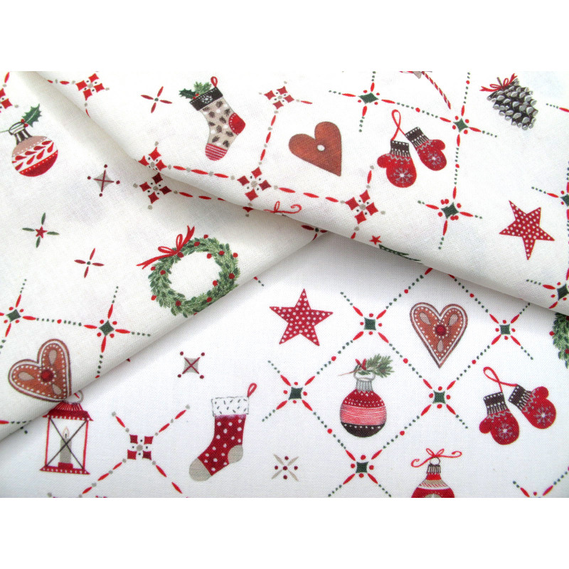 Der Baumwollstoff Weihnachtsornamente ist eine liebevolle Zusammenstellung klassischer Weihnachtssymbole, die an vertraute Rituale und festliche Kindheitserinnerungen erinnert. Gestaltet mit den detailreichen Illustrationen von Kerstin Heß zeigt dieser Stoff ein harmonisches Mosaik aus liebevoll platzierten Motiven auf hellem Grund. Christbaumkugeln, Herzen, Kränze, Zapfen, Lebkuchen, kleine Vögel, Strümpfe und Kerzen wechseln sich in regelmäßigen Abständen ab und sind durch feine, rot-grüne Linien zart miteinander verbunden. Die Farben in warmem Rot, Tannengrün und sanften Naturtönen unterstreichen den traditionellen Charakter dieses Designs und schaffen eine ruhige, nostalgische Weihnachtsstimmung Weihnachtsornamente eignet sich wunderbar für Patchworkarbeiten, Adventskalender, festliche Tischdecken oder liebevoll gestaltete Nähprojekte, die das Herz erwärmen und das Zuhause schmücken.