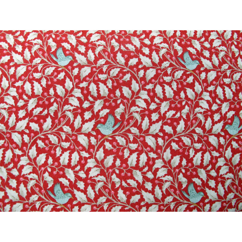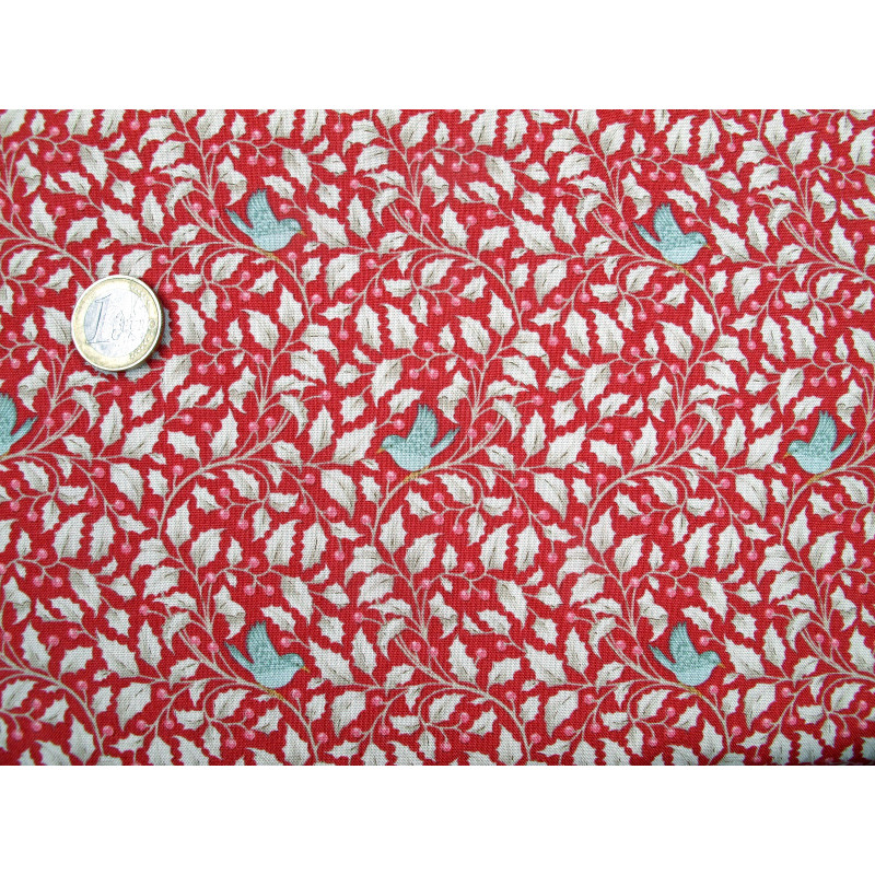 Design: kleine Vögel in türkis zwischen Ilex auf rotem Grund