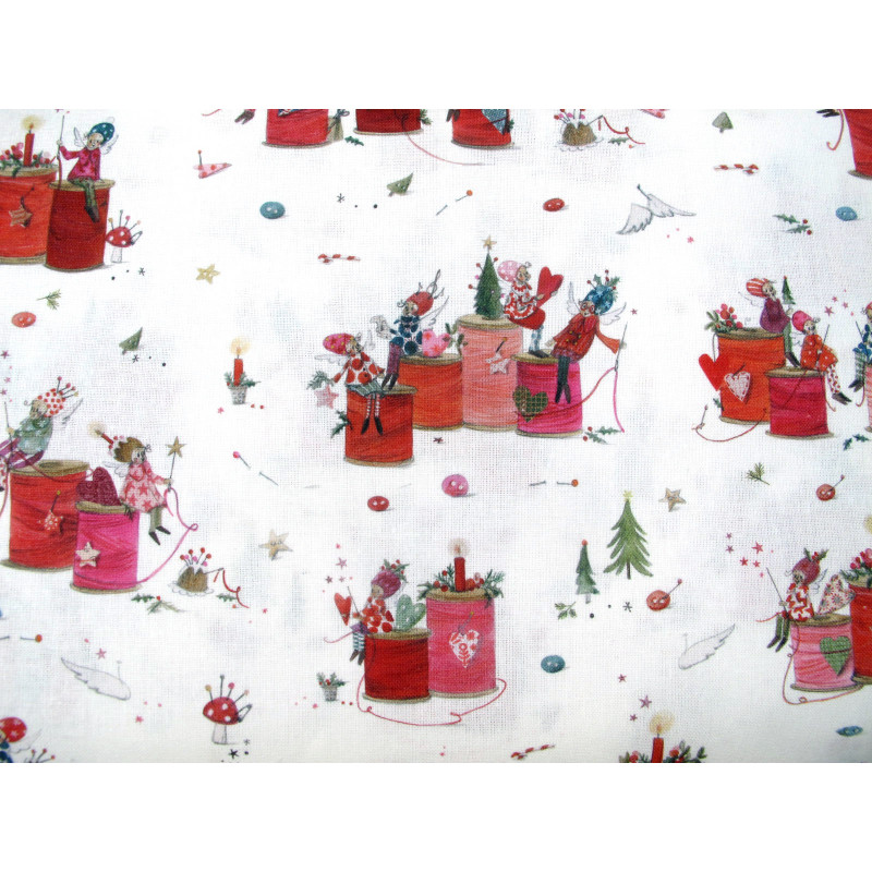 Der Baumwollstoff Fadenspiel Weihnachten ist liebevoll und detailreich gezeichnet von Silke Leffler für acufactum. Niedliche Engelchen sitzen auf Garnrollen und hantieren mit Nadel und Faden. Überall verstreut Sternchen und Knöpfe. Auf manchen Garnrollen leuchtet eine adventliche Kerze. Der Baumwolldruck lässt sich vielseitig einsetzen und bringt eine heitere, herzliche Note in jede weihnachtliche Nähidee.