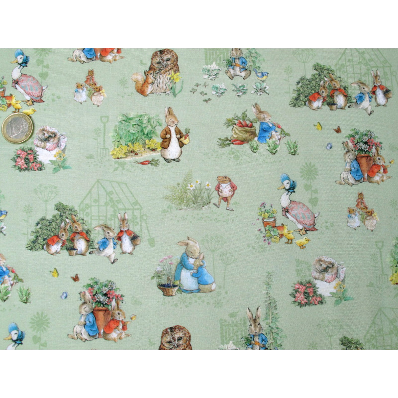 Design: Hase, Igel, Frosch, Ente, Gans nach Beatrix Potter auf hellgrün