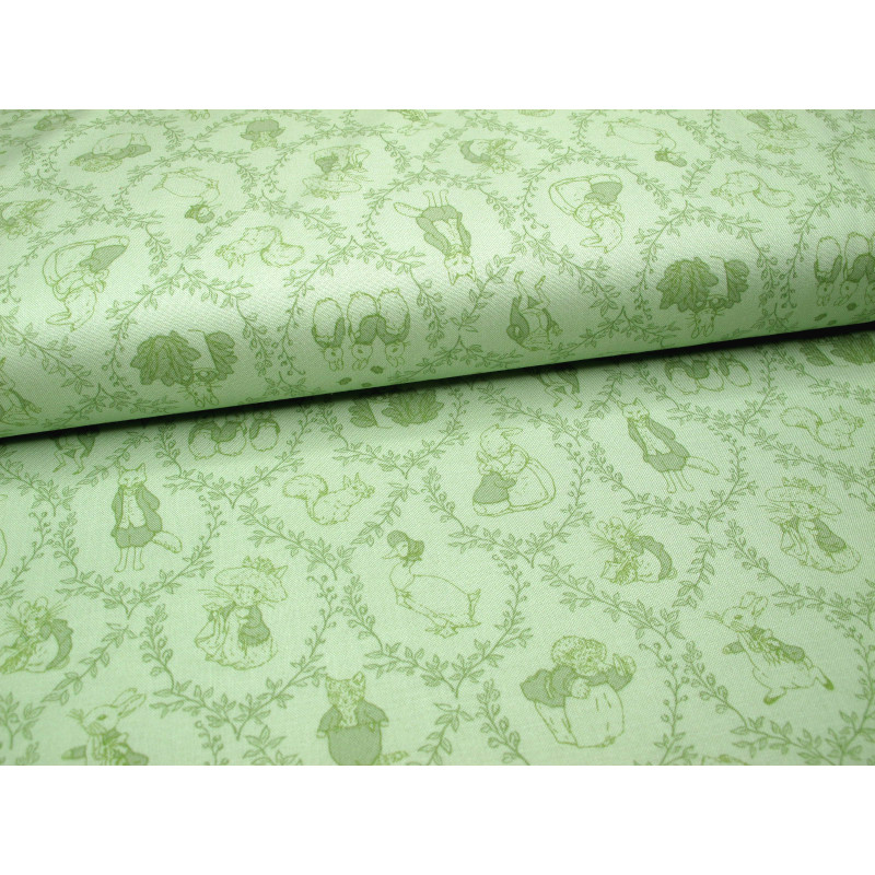 Design: Hase, Igel, Frosch, Ente, Gans nach Beatrix Potter auf hellgrün Ton-in-Ton