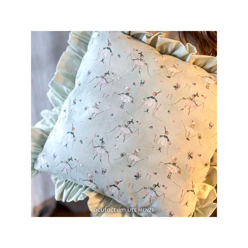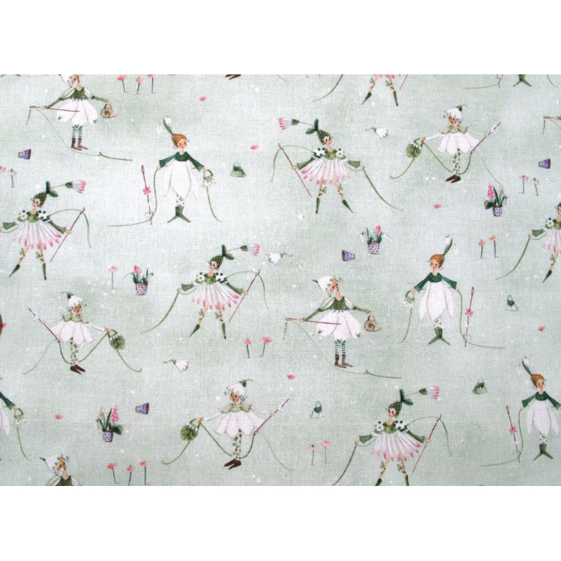 ein wunderschöner Baumwollstoff von acufactum in zartem grün für den Frühling. Kleine Blumenmädchen tanzen mit Nadel und Faden und freuen sich über das Erwachen der Natur.Zwischen ihnen blühen kleine Frühlingsboten in zarten Farben. Winzige Töpfe aus Fingerhüten, filigrane Blütenstiele und charmante Accessoires wie kleine Handtaschen bereichern das lebendige Motiv und verleihen ihm eine märchenhafte Leichtigkeit.