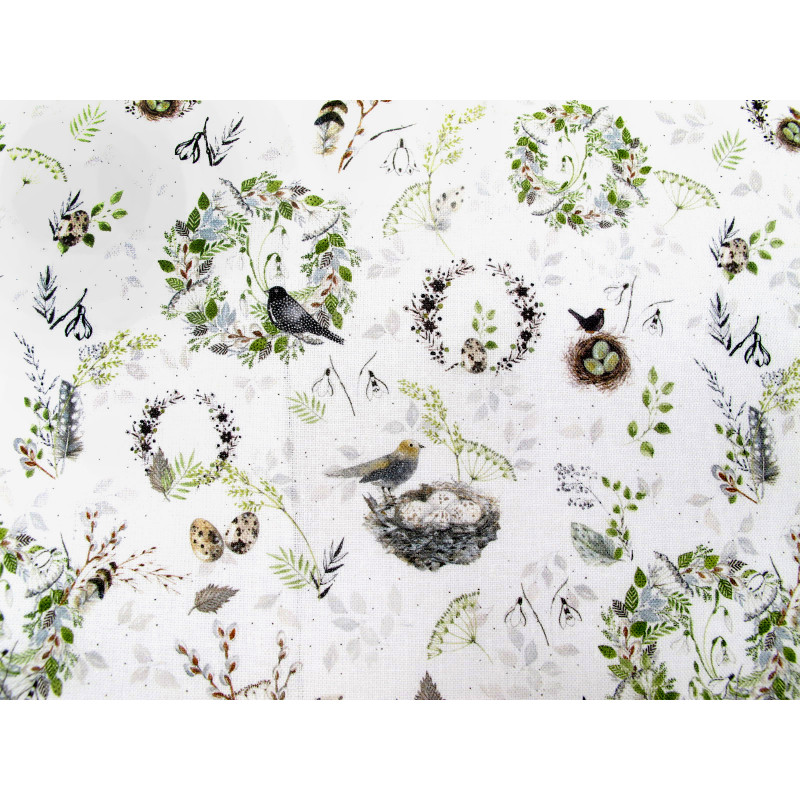 Design: Vögel Blätter Blumen Kränze Vogeleier Vogelnester auf gebrochenem weiß