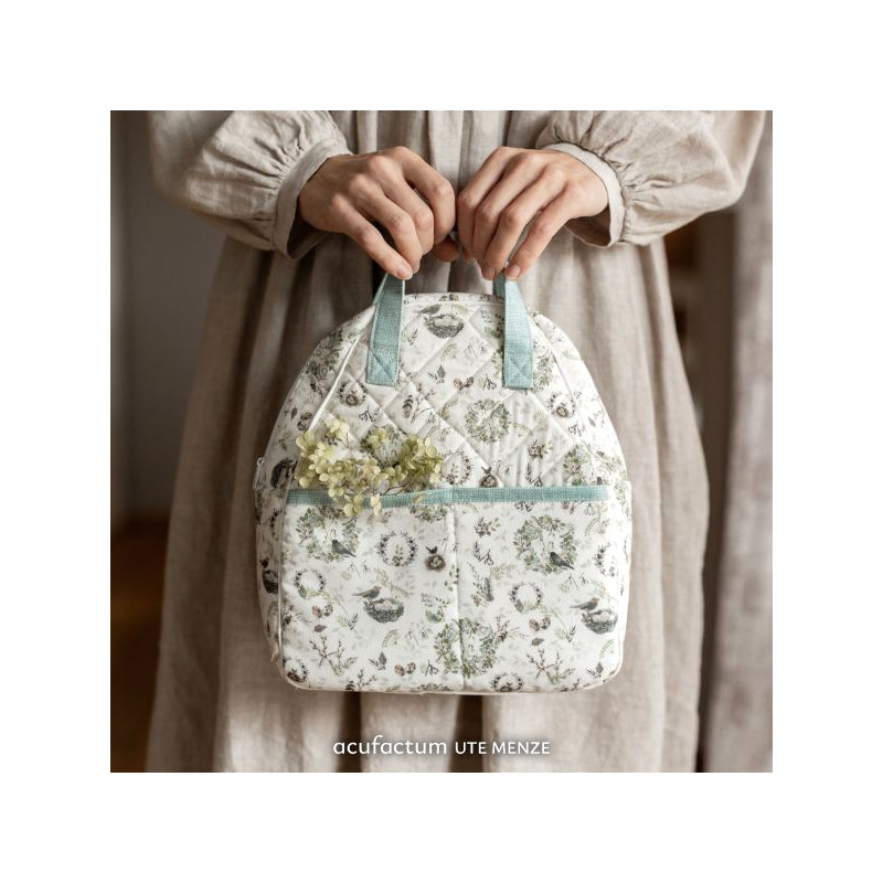 ein wunderschöner Baumwolldruck von acufactum. Feine Kränze aus frischem Grün, Frühjahrszweigen und ersten Blüten schmücken den Stoff und zwischen diesen Kränzen sitzen kleine Vögel in ihren Nestern, umrahmt von Federn, filigranen Zweigen und hübsch gesprenkelten Eiern, die wie kleine Vorboten des Frühlings wirken. Einzelne Blätter, helle Grünnuancen und feine botanische Illustrationen schaffen ein harmonisches Motiv, das an ruhige Spaziergänge durch einen erwachenden Garten erinnert. Der Stoff Frühlingskränze wurde designed von Kerstin Heß.