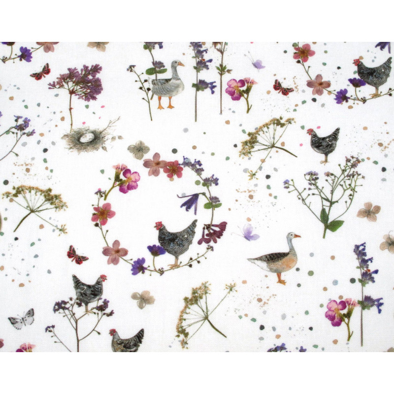 Design: Hühner, Gänse, Blüten, Tupfen auf weiß