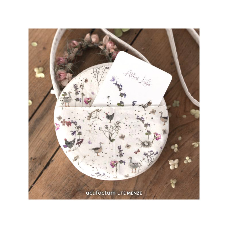 Zwischen zarten Frühlingsblüten, filigranen Zweigen und sanften Farbtupfern befinden sich kleine Gänse und Hühner, die eine ruhige, naturverbundene Stimmung in das Design bringen. Blütenkränze, Schmetterlinge und kleine Nester fügen sich zu einem harmonischen Gesamtbild zusammen