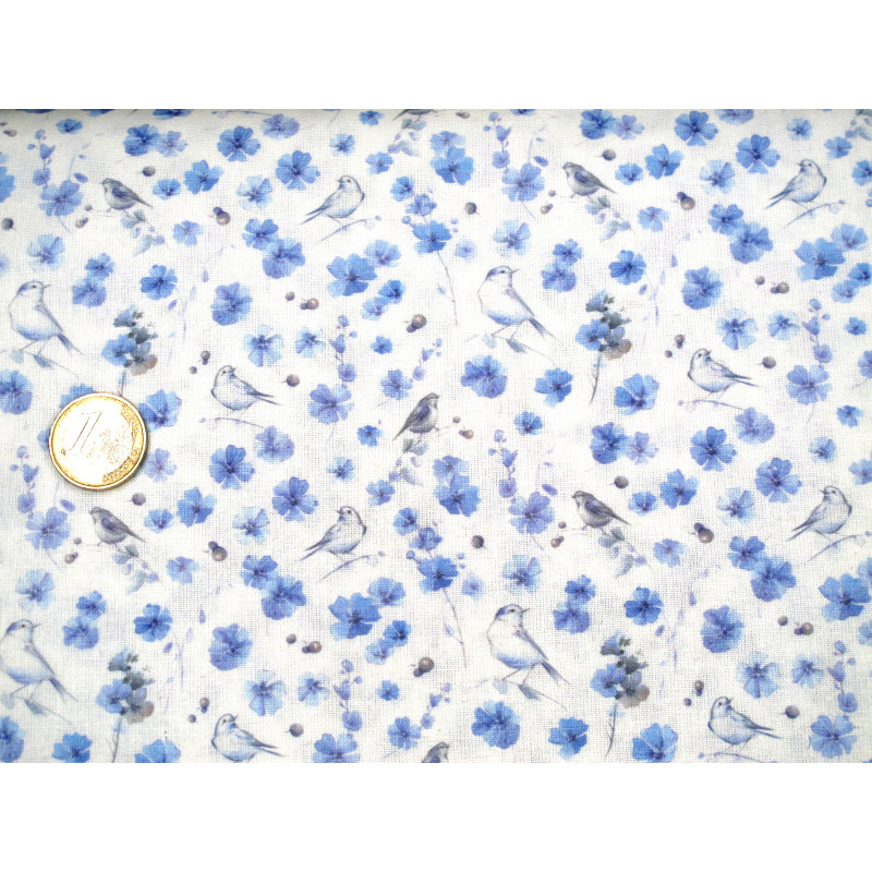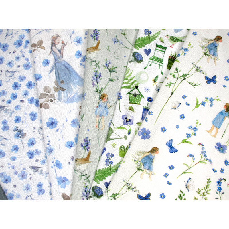 ein Stoffpaket mit 5 wunderschönen Stoffen von Daniela Drescher designed über acufactum in blau grün creme bedruckt mit Elfen Gräsern Lavendel Blumen und Gießkannen - perfekt aufeinander abgestimmt -