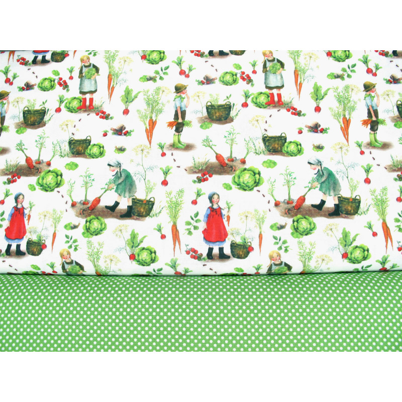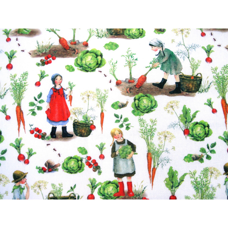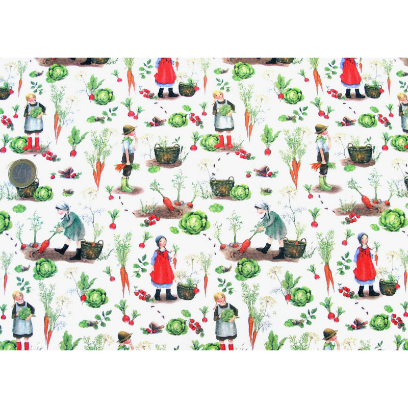 2 hochwertige Baumwollstoffe perfekt aufeinander abgestimmt. Kinder bei der Gemüseernte. Liebevoll und detailreich gezeichnet von Daniela Drescher. In Kombination mit einem dezent gemusterten Stoff für vielerlei Nähprojekte geeignet.Das Stoffpaket besteht aus 2 Stoffen im Maß 50 x 75 cm 100 % Baumwolle