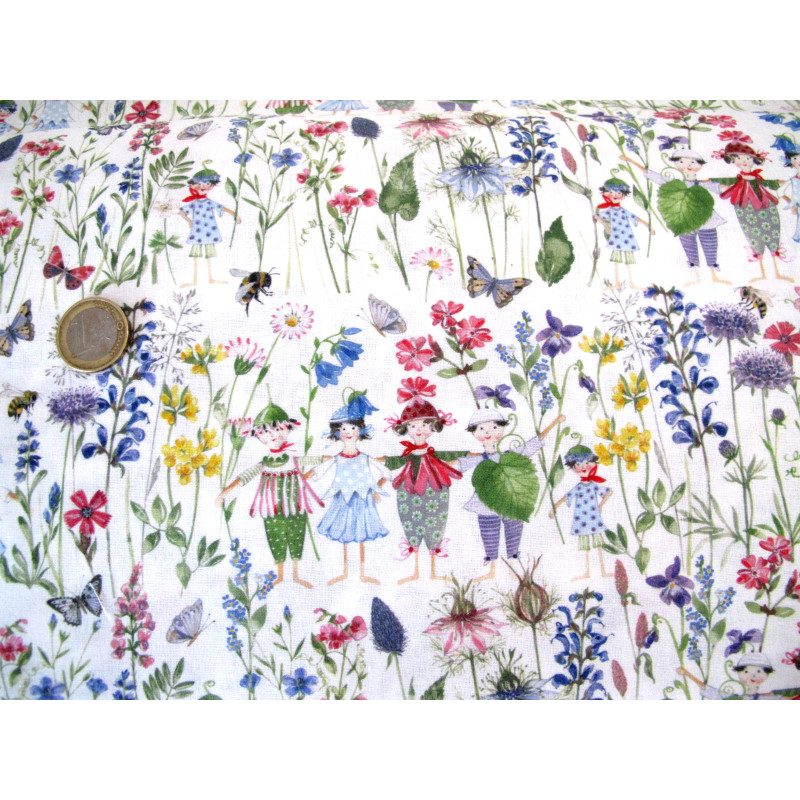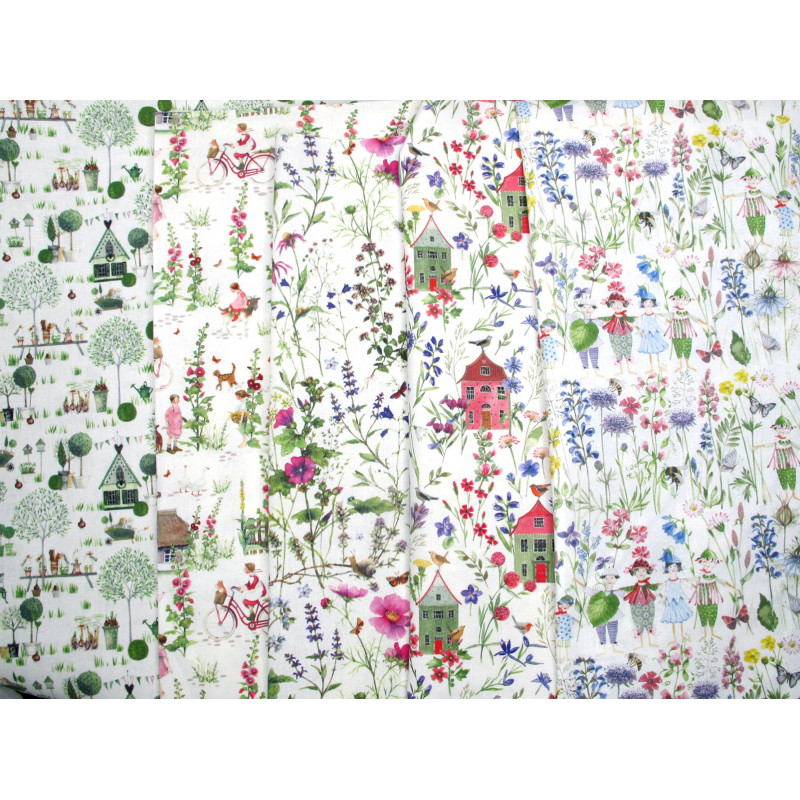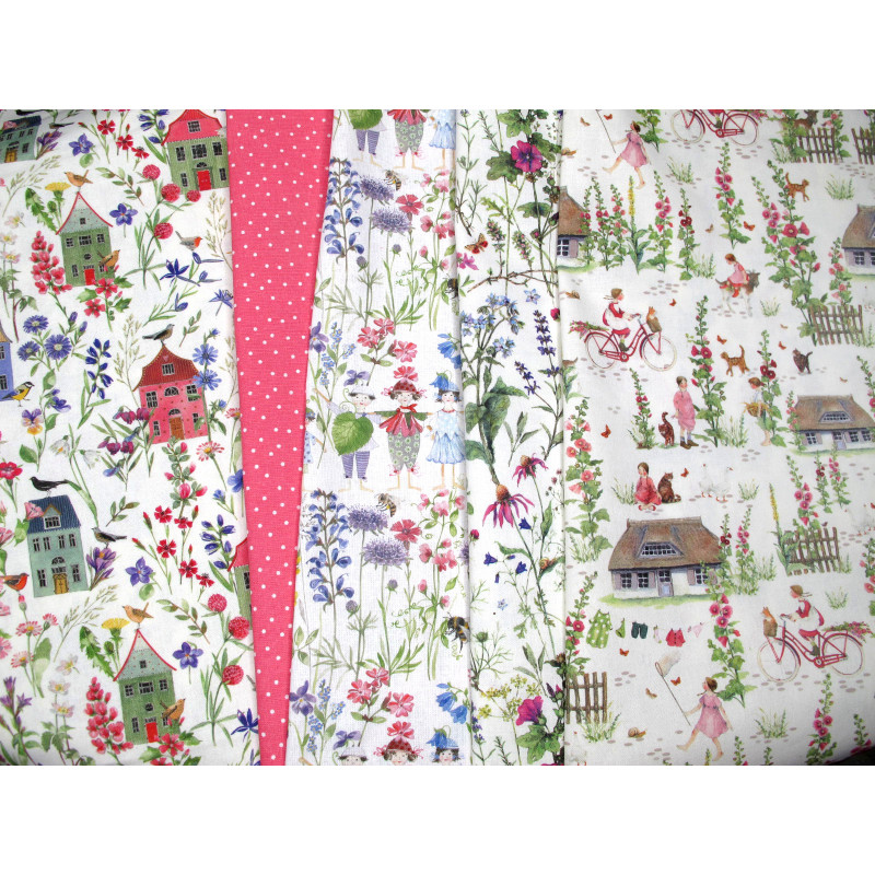 ein Stoffpaket mit 5 wunderschönen Stoffen von acufactum in grün rosa pink creme bedruckt mit Kindern Tieren Gräsern Blumen ..... designed von Daniela Drescher / Victoria Egert - perfekt aufeinander abgestimmt -