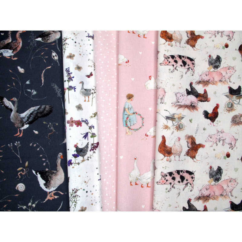 ein Stoffpaket mit 5 wunderschönen Stoffen von Daniela Drescher sowie Kerstin Heß designed in braun rosa bedruckt mit den Gänsen, Schweinchen, Hühnern, Mädchen....... - perfekt aufeinander abgestimmt - beide Stoffe von acufactum - zertifiziert nach ÖkoTex Standard 100 und in Europa hergestellt