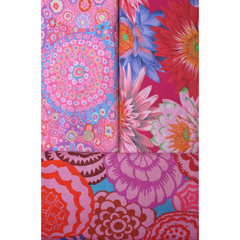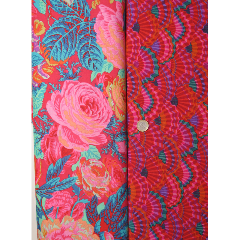 ein Stoffpaket mit 5 wunderschönen Stoffen von Kaffe Fassett in orange rot rosa bedruckt mit Blumen Kreisen Fächer - perfekt aufeinander abgestimmt -