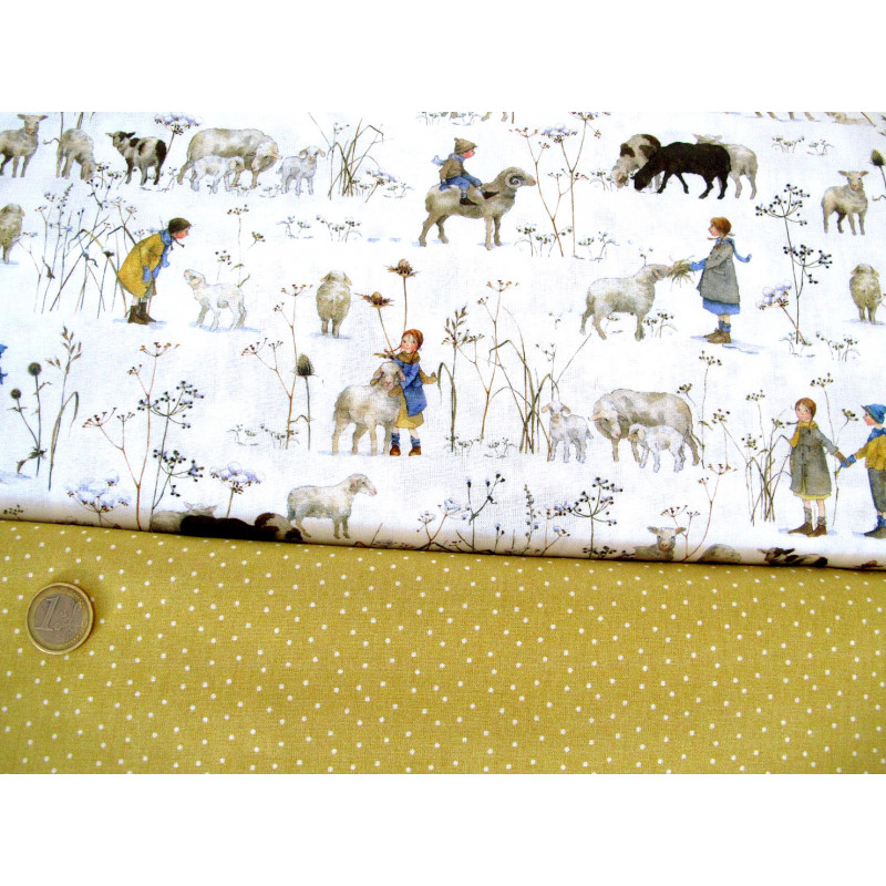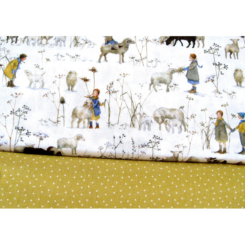 2 hochwertige Baumwollstoffe perfekt aufeinander abgestimmt. Liebevoll und detailreich gezeichnet von Daniela Drescher Schafe mit Kindern zwischen Gräsern. In Kombination mit einem Pünktchenstoff in senfgelb für vielerlei Nähprojekte geeignet. Beide Stoffe von acufactum