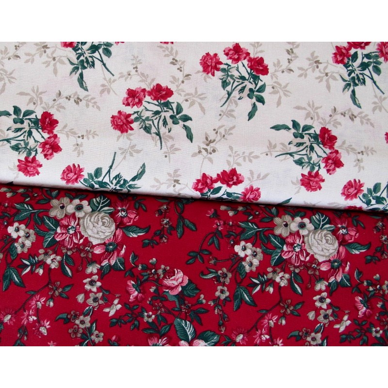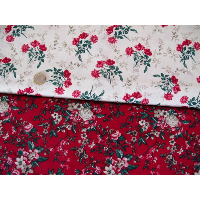 ein Stoffpaket mit 2 hochwertigen romantischen Baumwollstoffen von Westfalenstoffe bedruckt mit Rosen in weinrot dunkelgrün creme / hellbeige - beide aus der Serie Trondheim